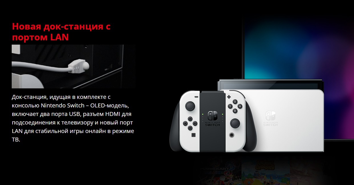 Док-станция, идущая в комплекте с консолью Nintendo Switch – OLED-модель, включает два порта USB, разъем HDMI для подсоединения к телевизору и новый порт LAN для стабильной игры онлайн в режиме ТВ.