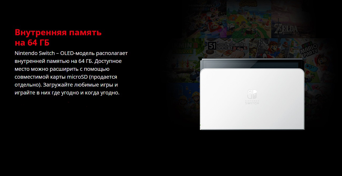 Nintendo Switch – OLED-модель располагает внутренней памятью на 64 ГБ. Доступное место можно расширить с помощью совместимой карты microSD до 2 Тб (продается отдельно). Загружайте любимые игры и играйте в них где угодно и когда угодно.
