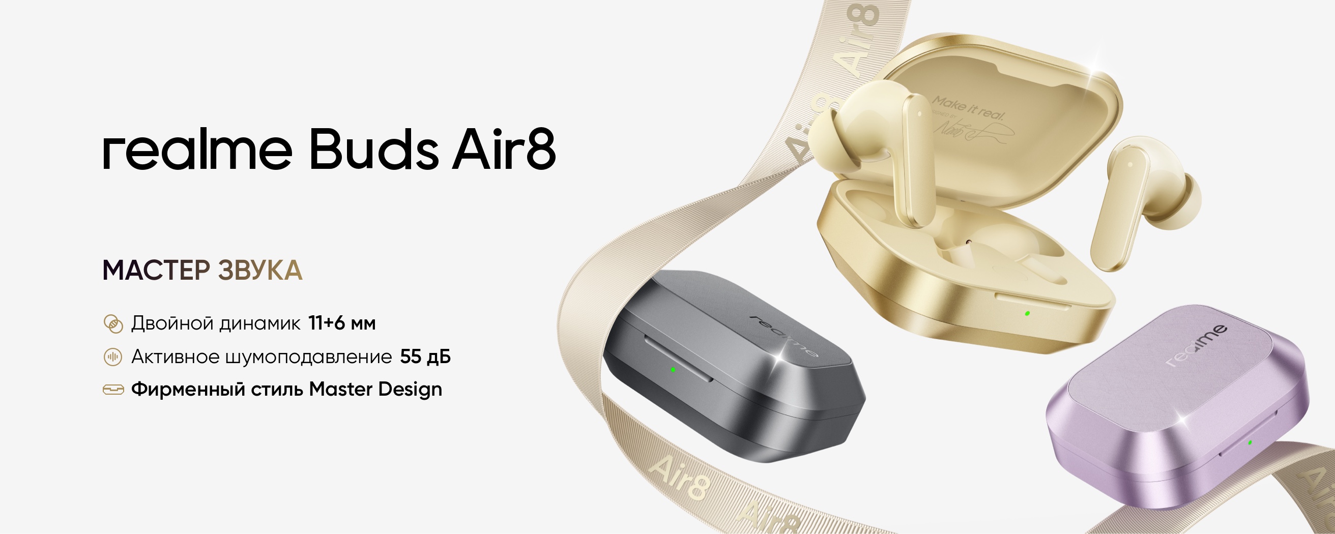 Одним из ключевых преимуществ модели является автономная работа до 58 часов с использованием зарядного кейса при отключённом ANC. Защита от пыли и влаги по стандарту IP55 делает Realme Buds Air8 подходящими для повседневного использования, тренировок и активного образа жизни. Дополняют образ три цветовых варианта — чёрный, золотой и фиолетовый, подчёркивающие универсальность и актуальный дизайн модели.| Страна-производитель | Китай |