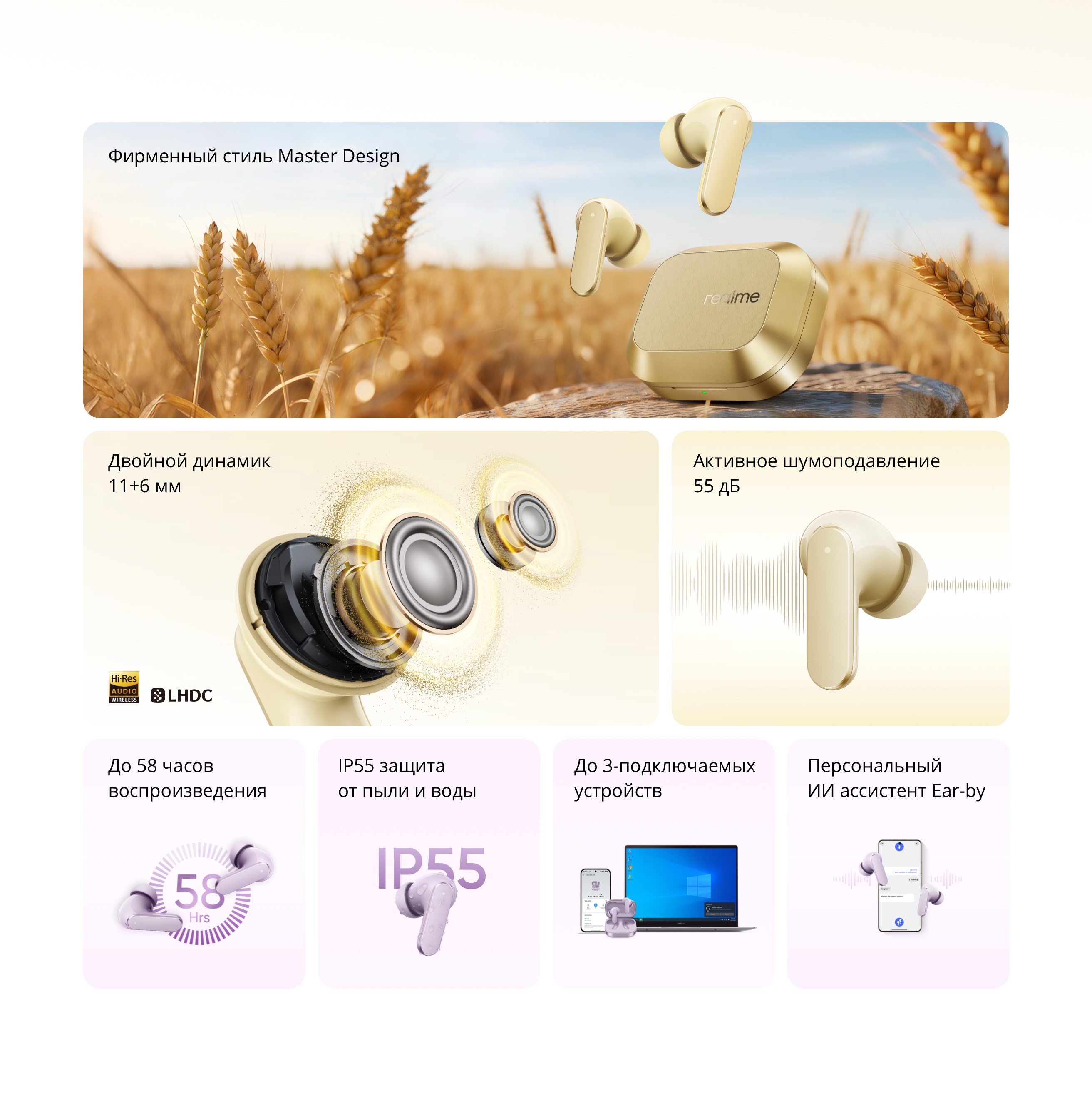 Современные беспроводные TWS-наушники с продвинутой системой активного шумоподавления до 55 дБ и расширенным диапазоном подавления до 5000 Гц, разработанные для комфортного прослушивания музыки и общения в шумной среде. Двухдрайверная акустическая система 11 мм + 6 мм в сочетании с поддержкой аудиокодека LHDC 5.0 обеспечивает детальное, объёмное звучание без потерь, а шесть микрофонов повышают чёткость голосовых вызовов. Режим сверхнизкой задержки 45 мс подойдёт для игр, а автономность до 58 часов и защита IP55 делают модель универсальной для повседневного использования.