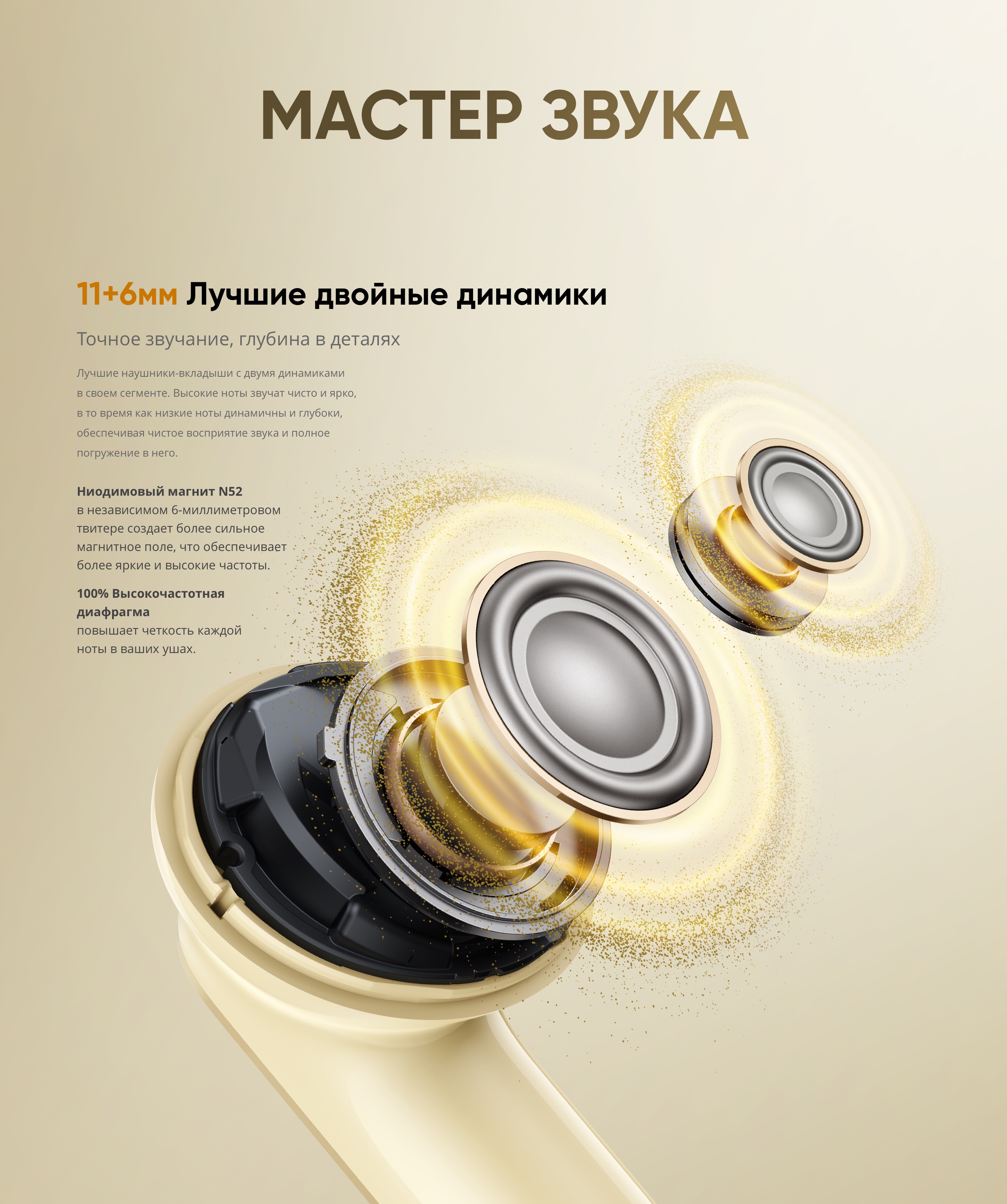 Звуковая архитектура наушников построена на двухдрайверной системе с динамиками 11 мм и 6 мм, что позволяет разделить частотные диапазоны и добиться более объёмного и детализированного звучания. Такая конфигурация формирует плотный бас, выразительную середину и чистые высокие частоты, создавая многослойную звуковую сцену для музыки разных жанров.