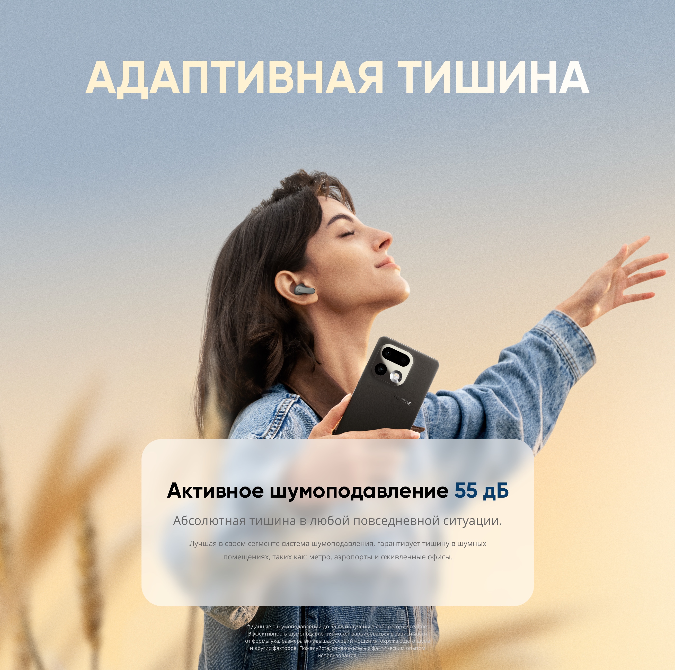 Беспроводные наушники Realme Buds Air8 делают ставку на продвинутую систему активного шумоподавления с глубиной до 55 дБ и рабочим диапазоном до 5000 Гц. Такое решение ориентировано на эффективное подавление низких и средних частот — от городского шума до гула транспорта. В результате формируется контролируемое звуковое пространство, подходящее как для работы, так и для длительных поездок.