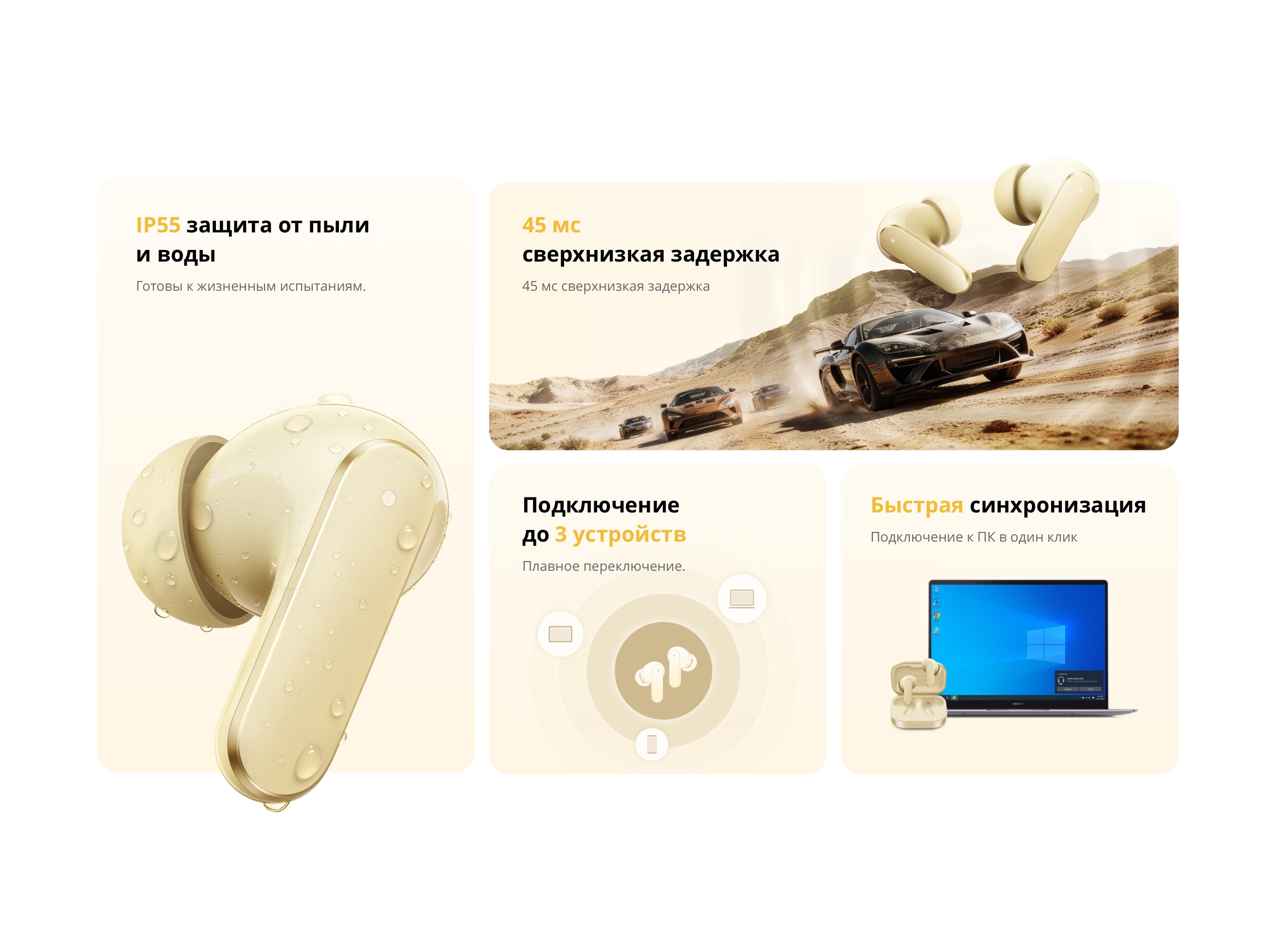 Для геймеров предусмотрен режим сверхнизкой задержки 45 мс, который синхронизирует звук с изображением и повышает точность восприятия в динамичных сценариях. Интеллектуальные возможности дополняются переводом речи и звонков в реальном времени с помощью ИИ, расширяя функциональность наушников за пределы стандартного аудиоустройства.