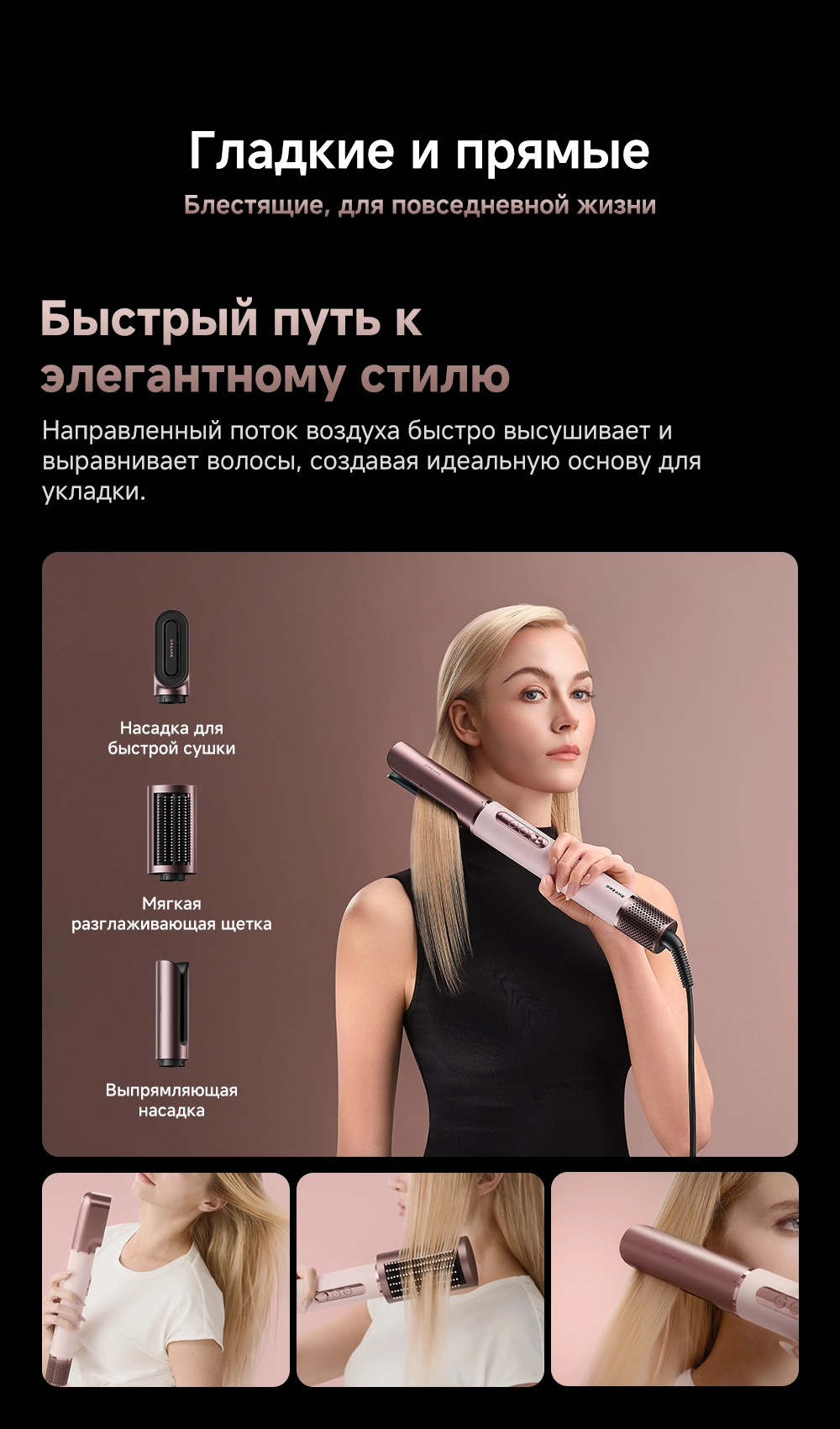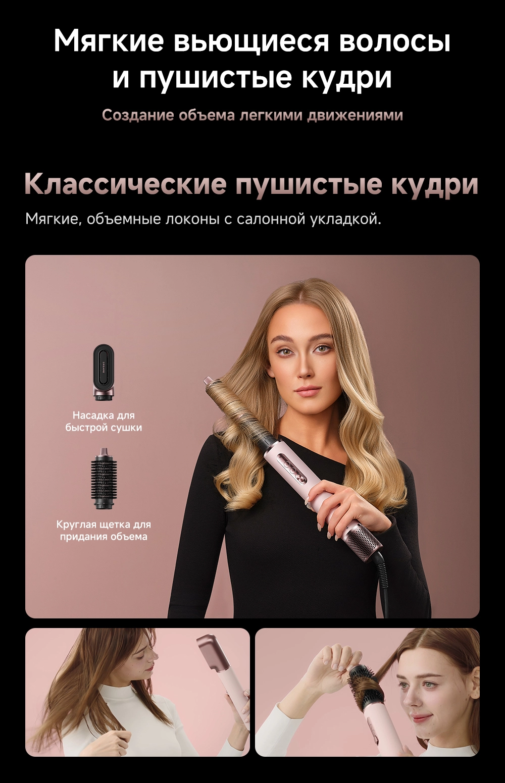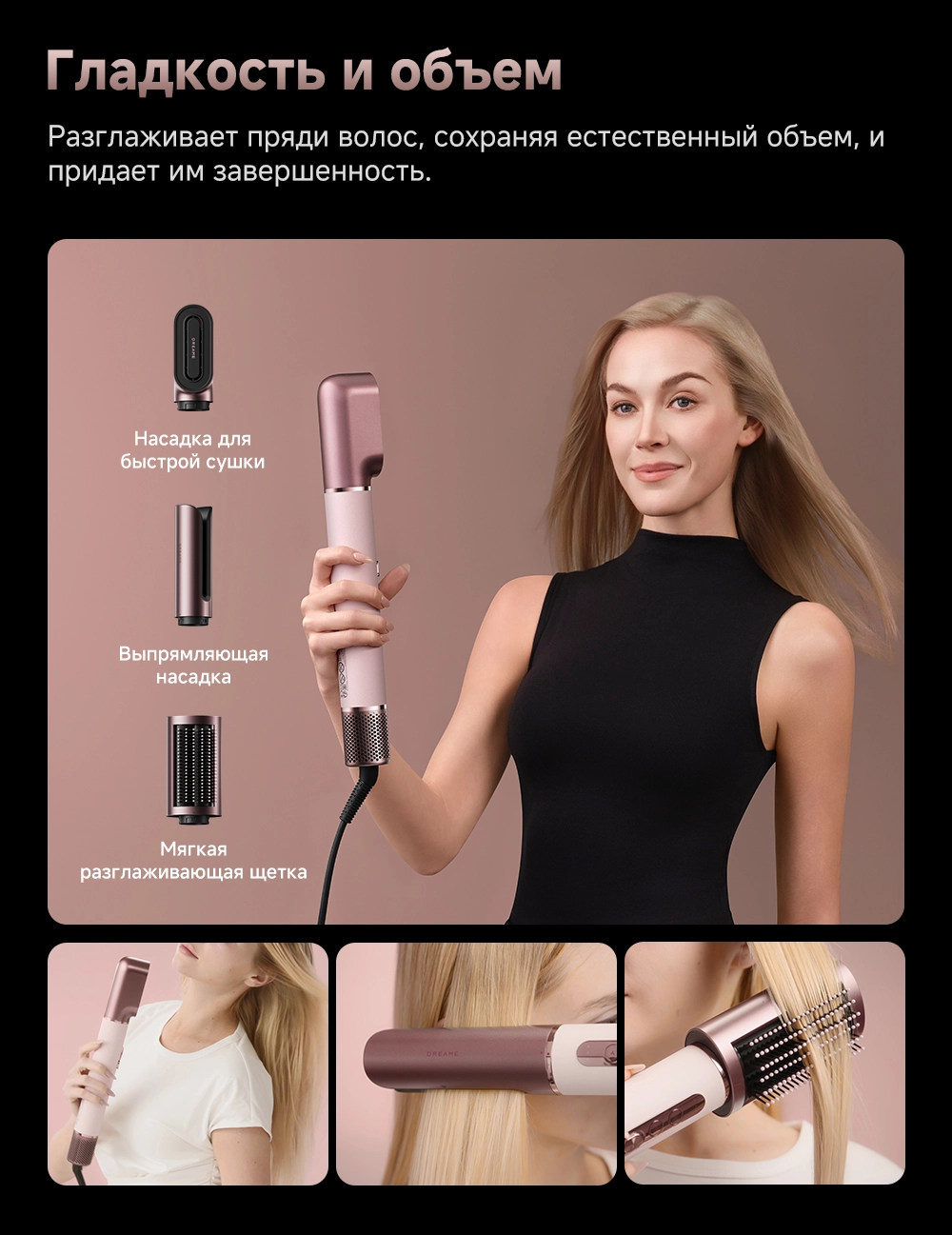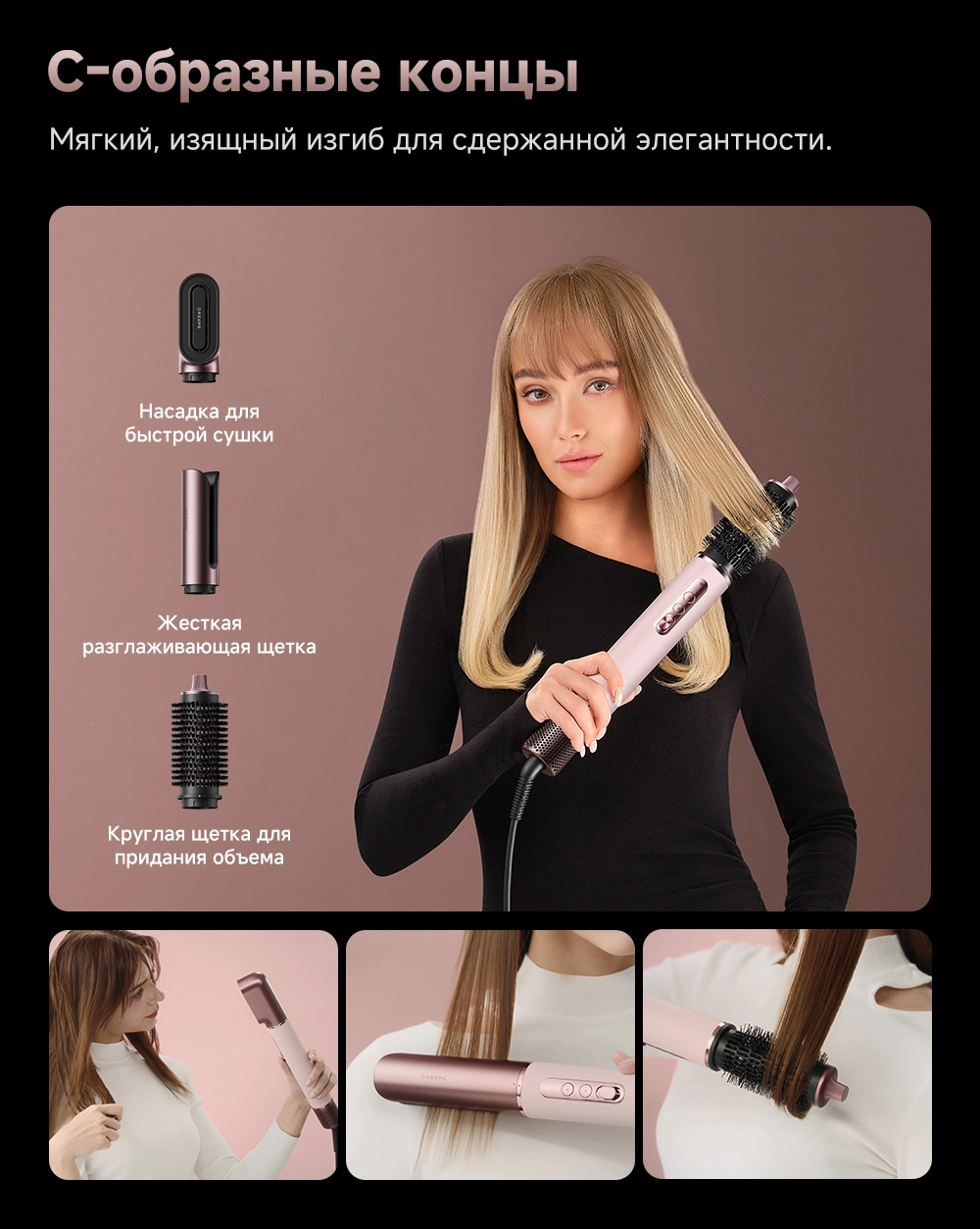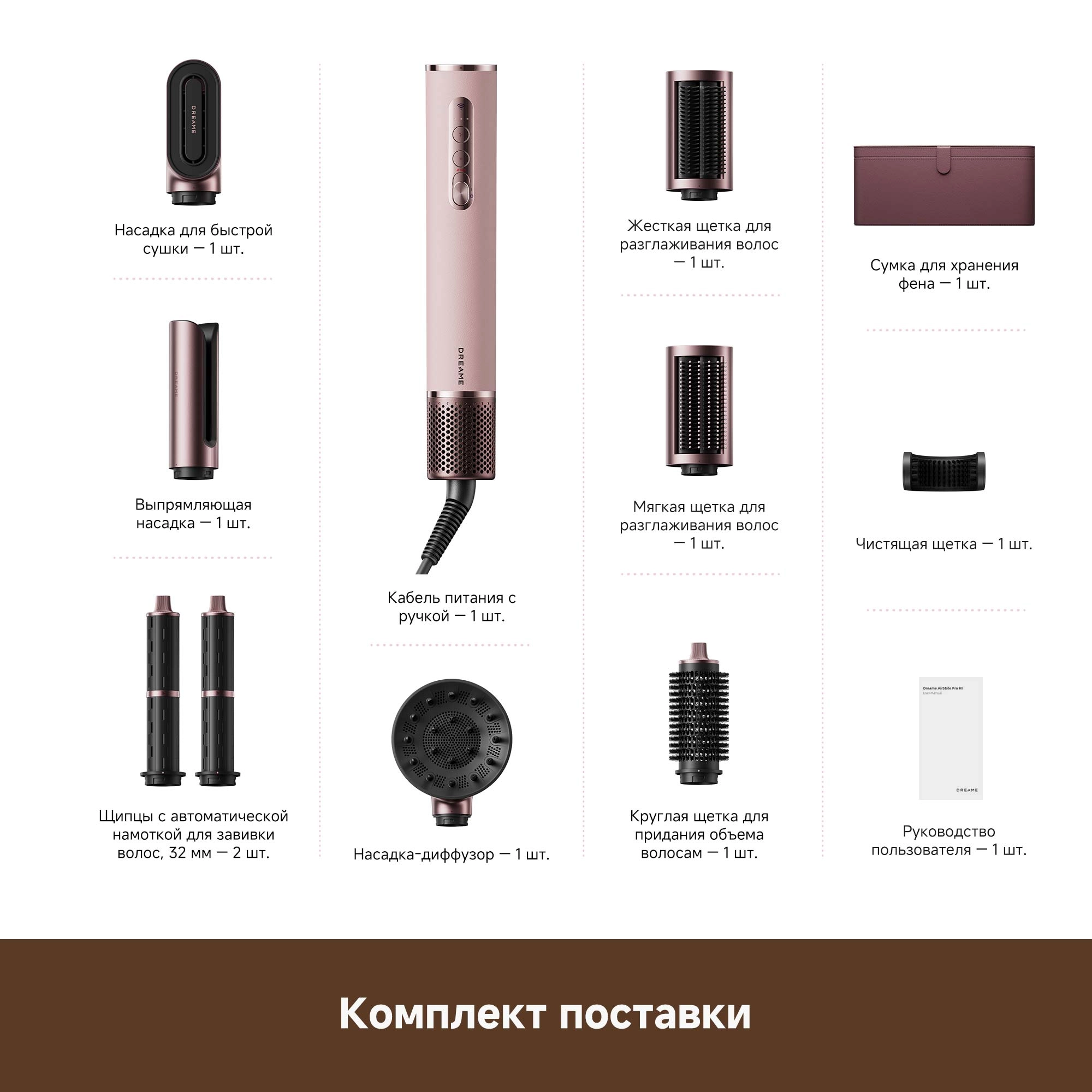 - Типы насадок в комплекте: 2 насадки для завивки волос 32мм / Диффузор / Жесткая щетка для разглаживания волос / Круглая щетка для придания объема волосам / Мягкая щетка для разглаживания волос / Насадка для быстрой сушки / Насадка для выпрямления волос