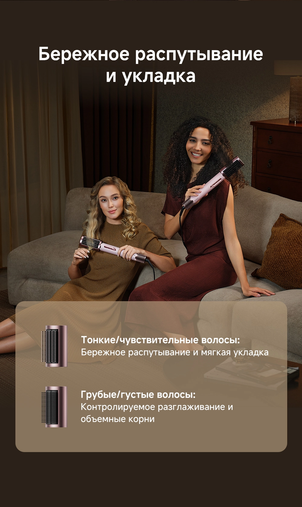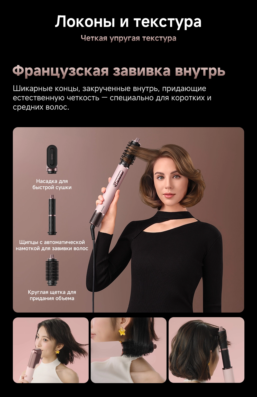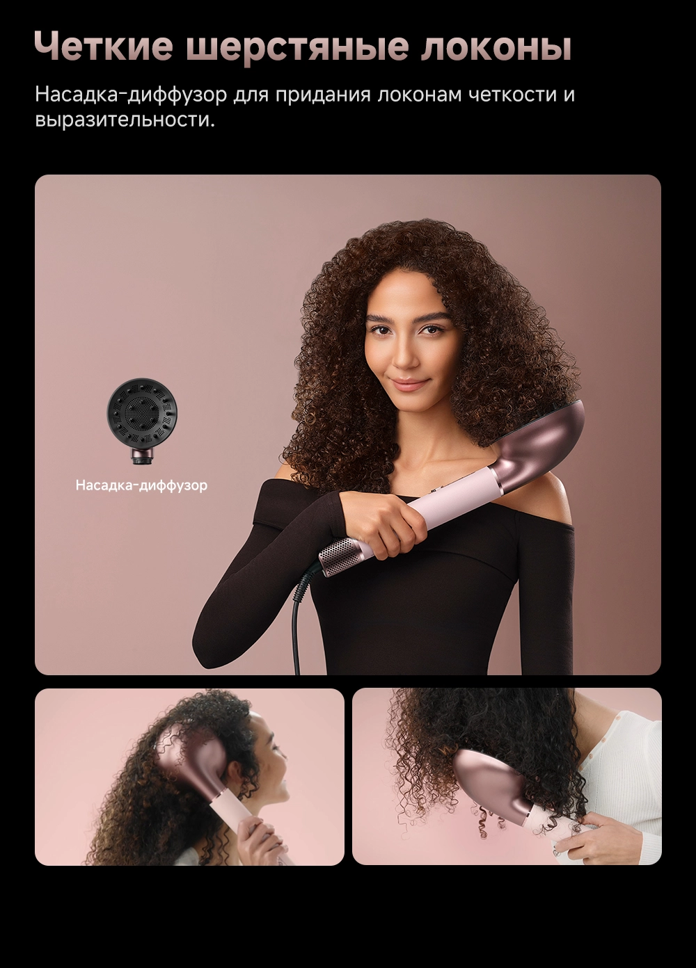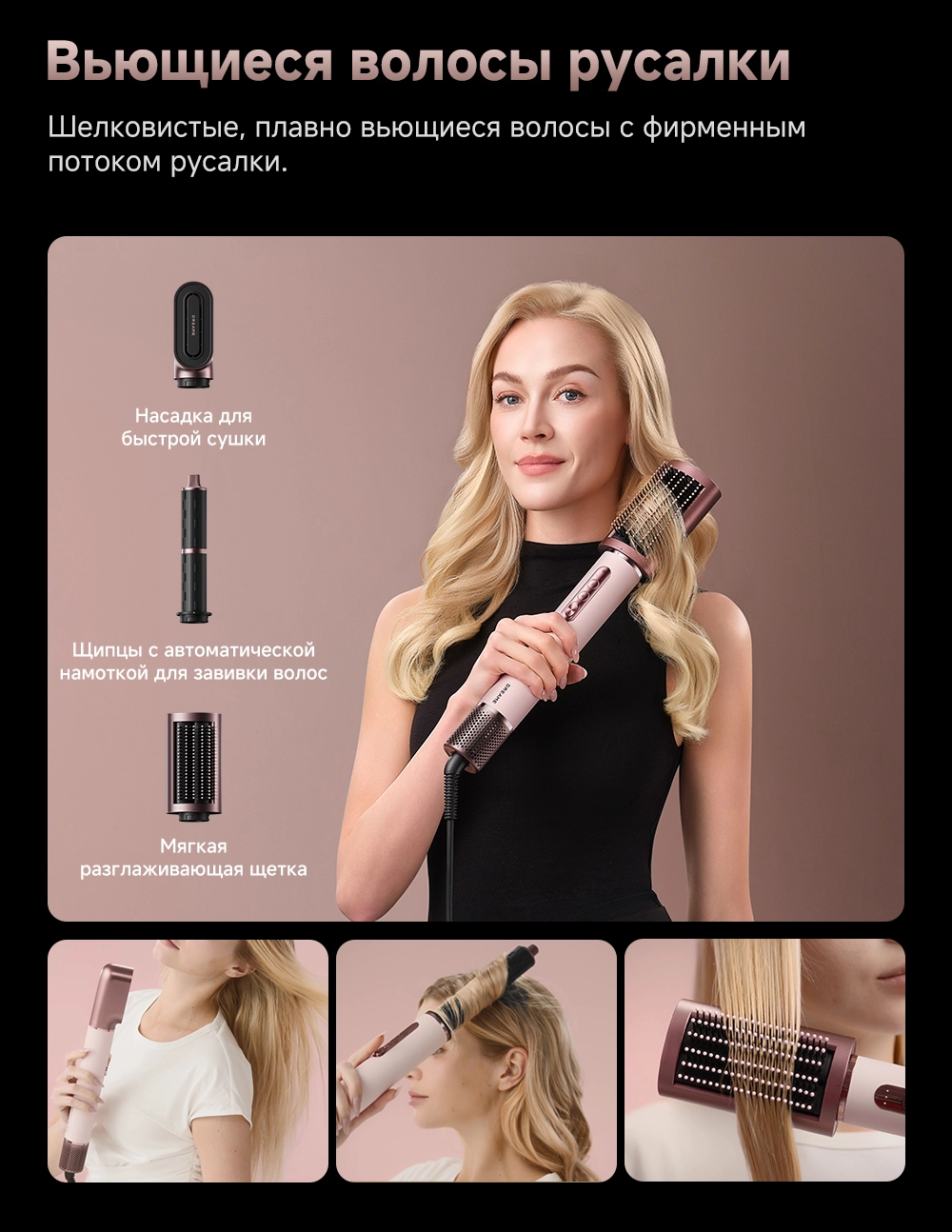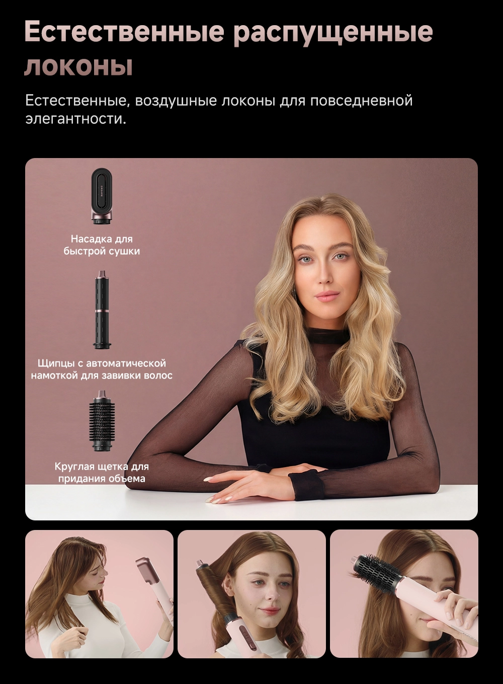 - Типы насадок в комплекте: 2 насадки для завивки волос 32мм / Диффузор / Жесткая щетка для разглаживания волос / Круглая щетка для придания объема волосам / Мягкая щетка для разглаживания волос / Насадка для быстрой сушки / Насадка для выпрямления волос
