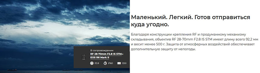 Благодаря конструкции крепления RF и продуманному механизму складывания, объектив RF 28-70mm F2.8 IS STM имеет длину всего 92,2 мм и весит менее 500 г. Защита от атмосферных воздействий обеспечивает дополнительную защиту от непогоды.