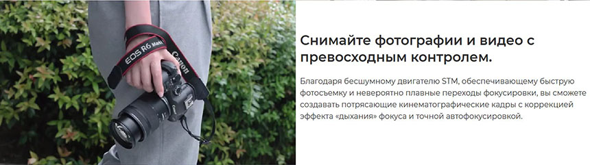 Благодаря бесшумному двигателю STM, обеспечивающему быструю фотосъемку и невероятно плавные переходы фокусировки, вы сможете создавать потрясающие кинематографические кадры с коррекцией эффекта «дыхания» фокуса и точной автофокусировкой.