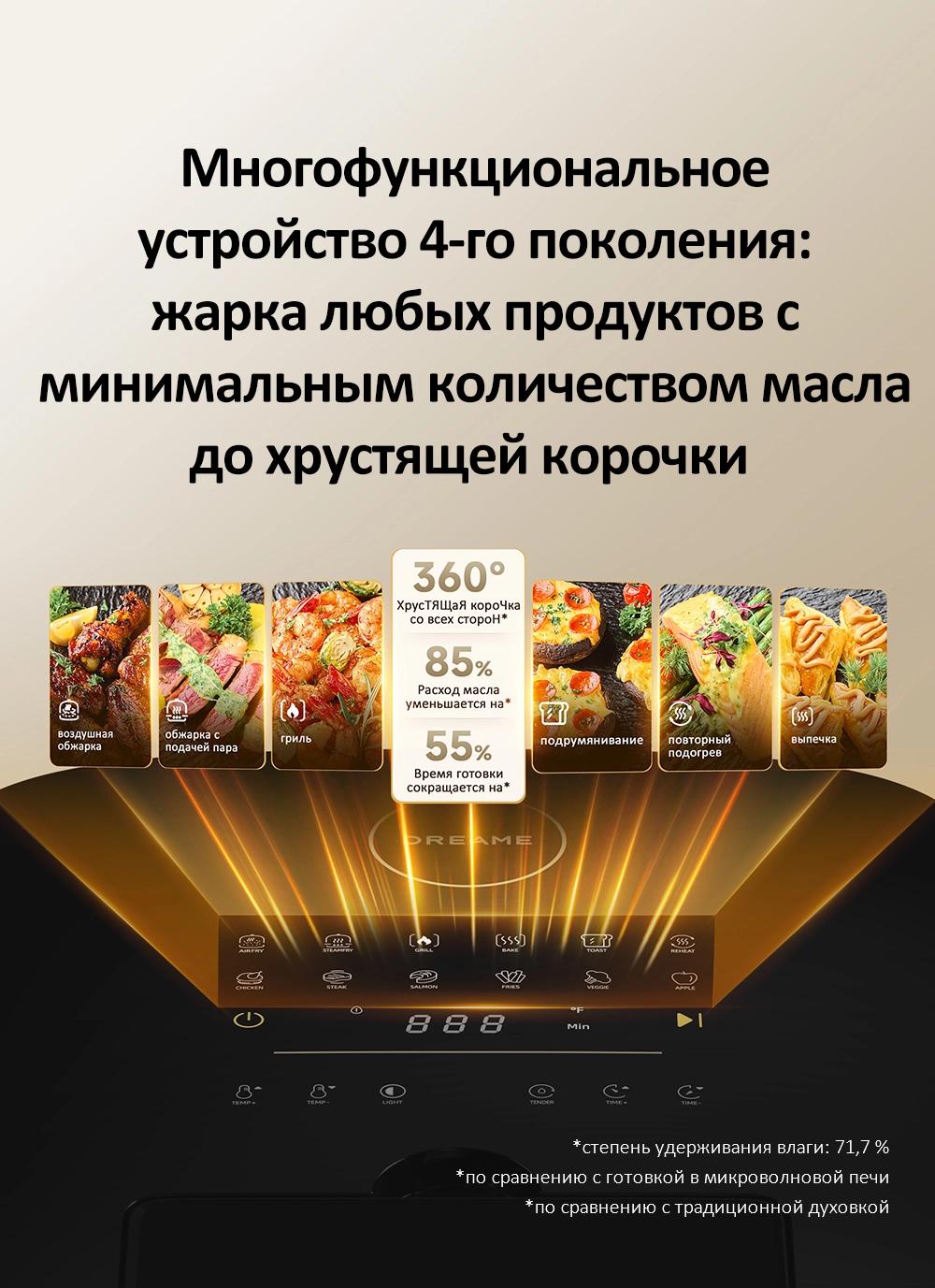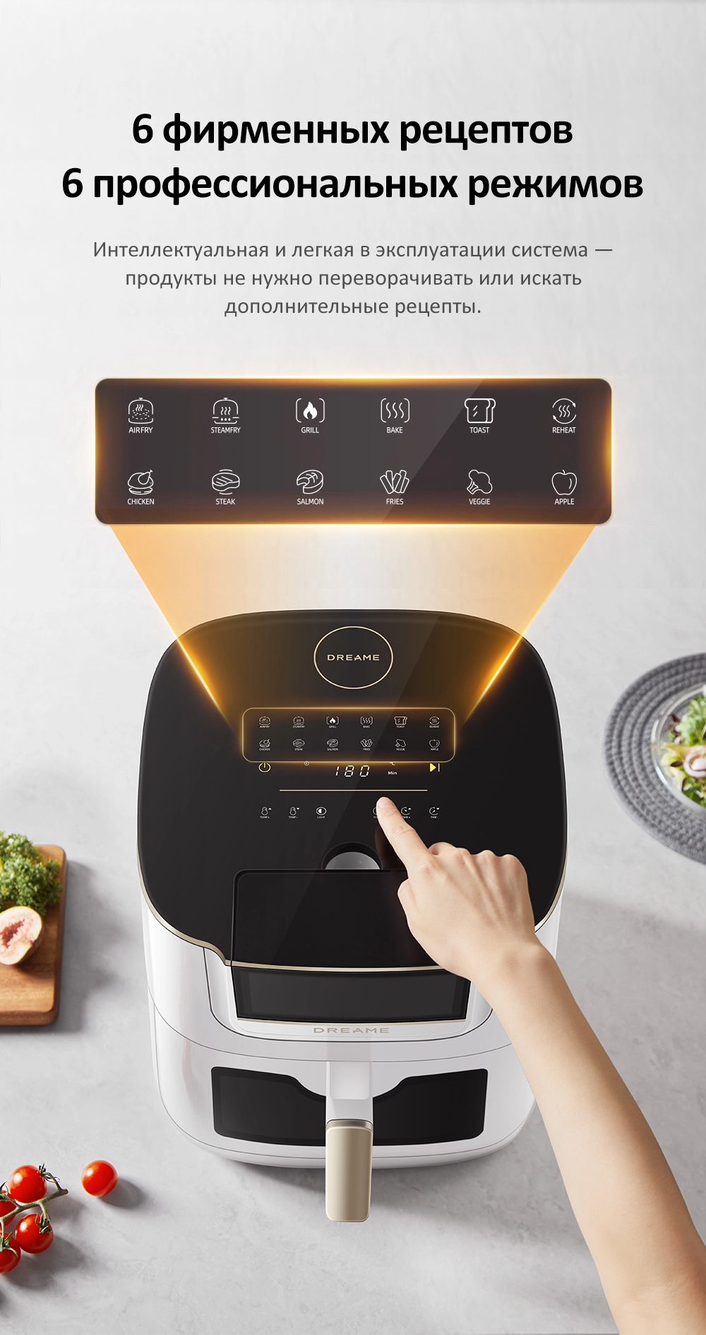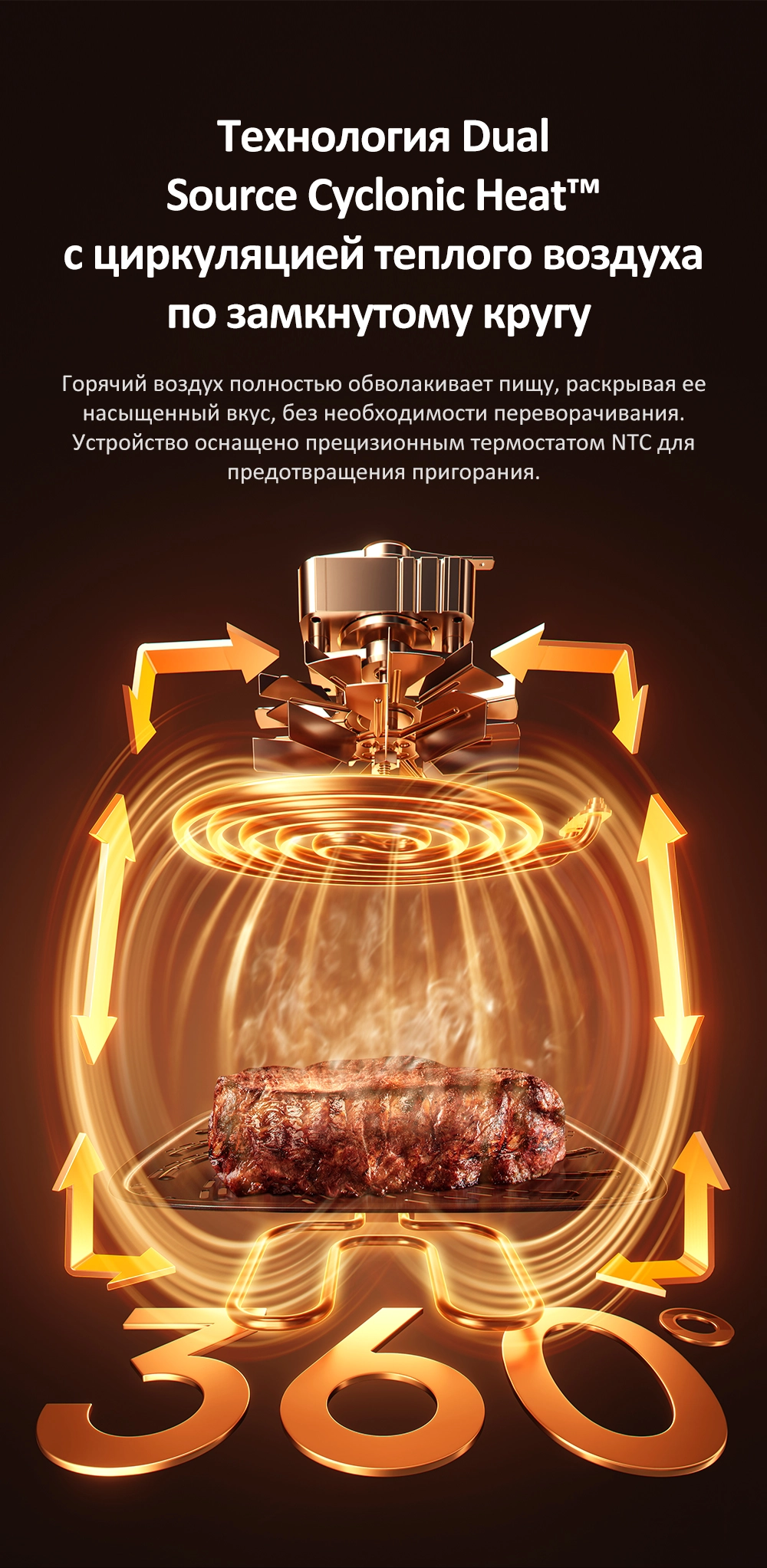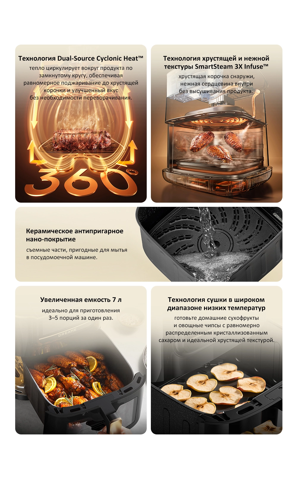 - Особенности: Жарка любых продуктов с минимальным количеством масла. Керамическое антипригарное покрытие. Технология приготовления с паром SmartSteam 3X Infuse. Технология Dual Source Cyclonic Heat, обеспечивающая циркуляцию горячего воздуха по кругу