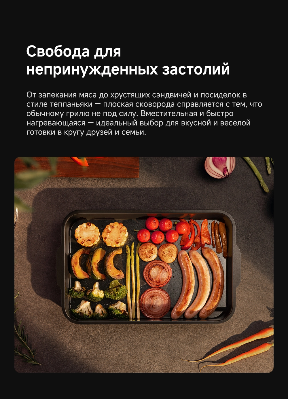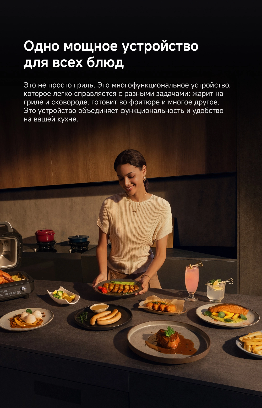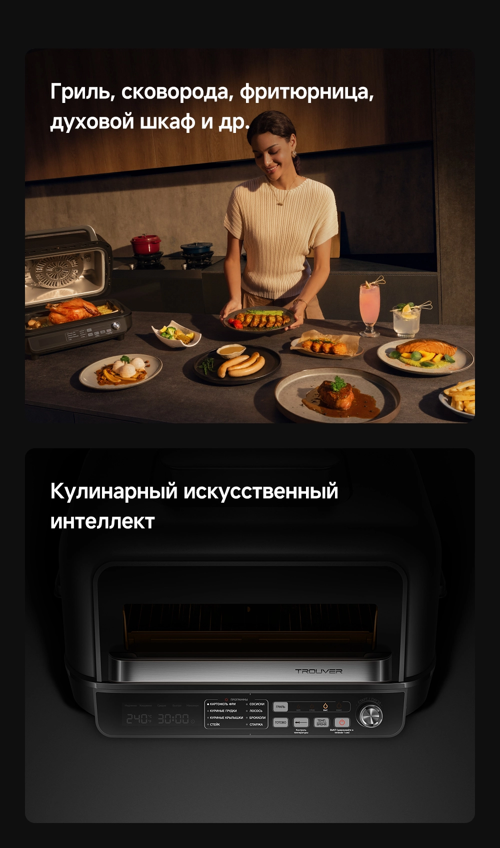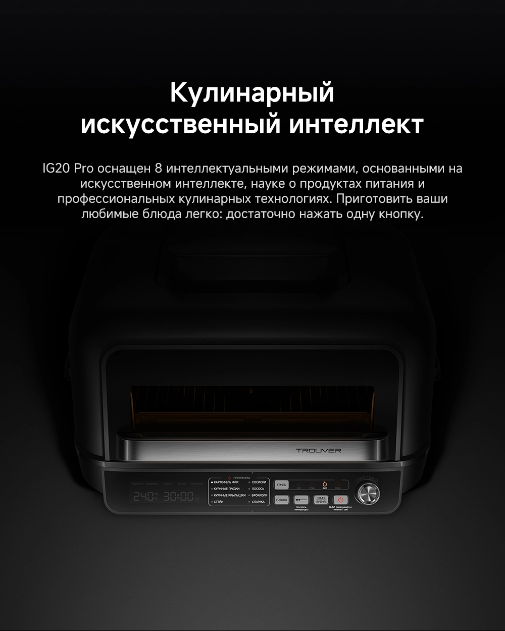 - Список режимов/программ приготовления: брокколи, картофель фри, куриная грудка, куриные крылышки, лосось, сосиски, спаржа, стейк