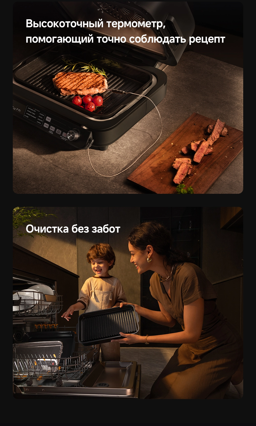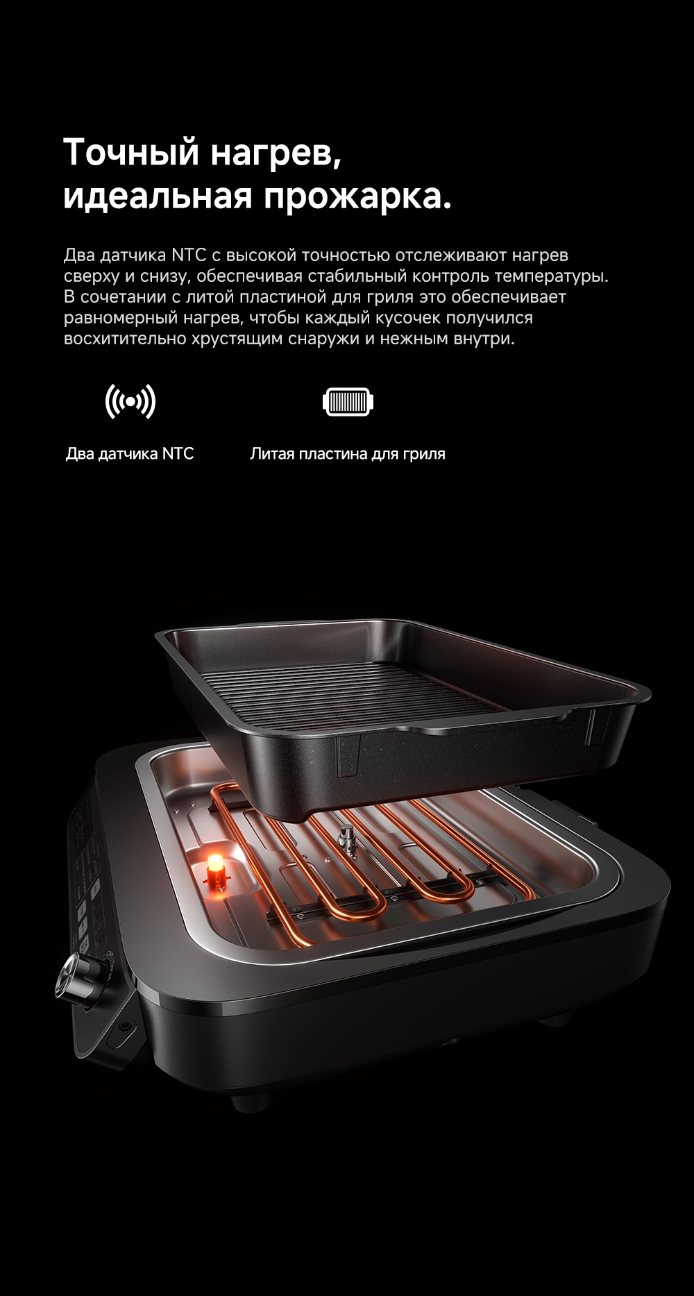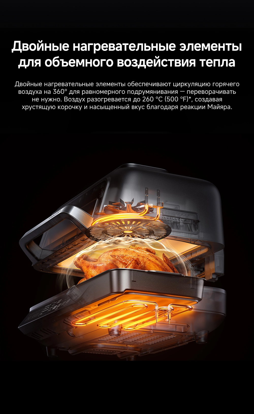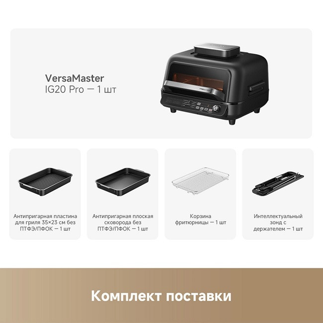 - Особенности: умный многофункциональный гриль и аэрофритюрница, мощный нагрев и точный контроль, высокоточный термометр, два датчика NTC, широкое смотровое окно, две яркие лампы по 40 Вт, большая поверхность гриля 35х23 см, литая пластина для гриля, оснащен 8 интеллектуальными режимами (основанными на искусственном интеллекте), двойные нагревательные элементы для объемного воздействия тепла - циркуляция горячего воздуха на 360, максимальная температура для нагрева 260С, емкость 6.5 л, профессиональная кулинария с пошаговыми рецептами, очистка без забот - все аксессуары имеют антипригарное покрытие без ПТФЭ/ПФОК и пригодны для мытья в посудомоечной машине, источник нагрева - верхний и нижний нагревательные элементы