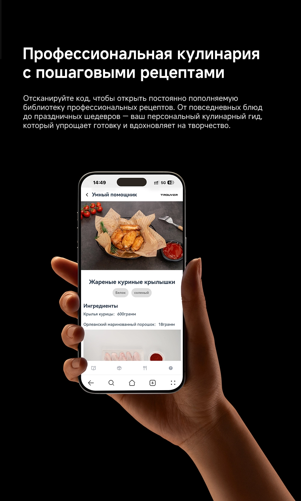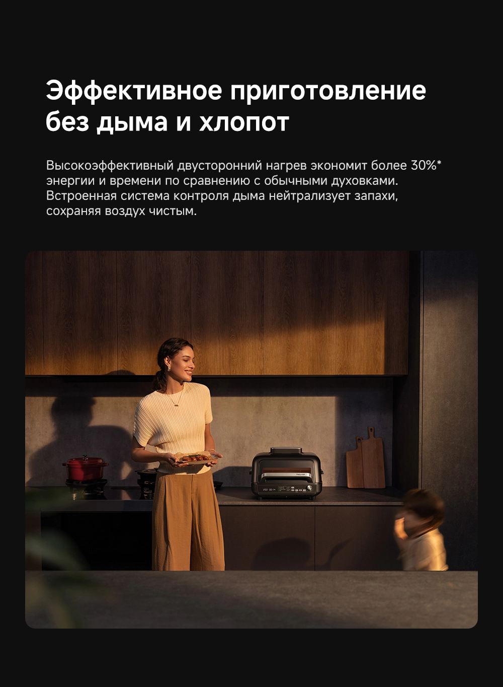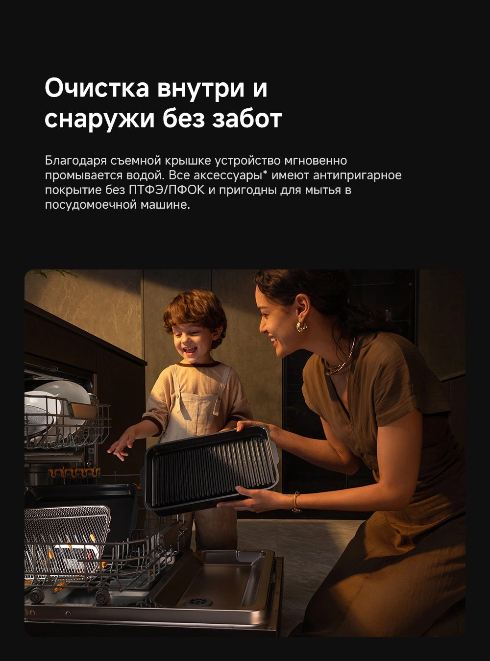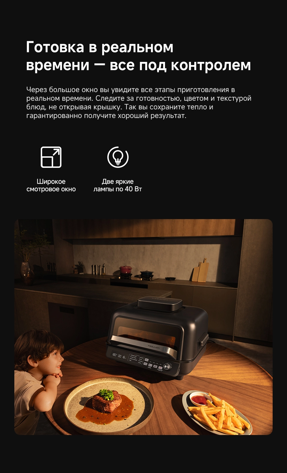 - Особенности: умный многофункциональный гриль и аэрофритюрница, мощный нагрев и точный контроль, высокоточный термометр, два датчика NTC, широкое смотровое окно, две яркие лампы по 40 Вт, большая поверхность гриля 35х23 см, литая пластина для гриля, оснащен 8 интеллектуальными режимами (основанными на искусственном интеллекте), двойные нагревательные элементы для объемного воздействия тепла - циркуляция горячего воздуха на 360, максимальная температура для нагрева 260С, емкость 6.5 л, профессиональная кулинария с пошаговыми рецептами, очистка без забот - все аксессуары имеют антипригарное покрытие без ПТФЭ/ПФОК и пригодны для мытья в посудомоечной машине, источник нагрева - верхний и нижний нагревательные элементы