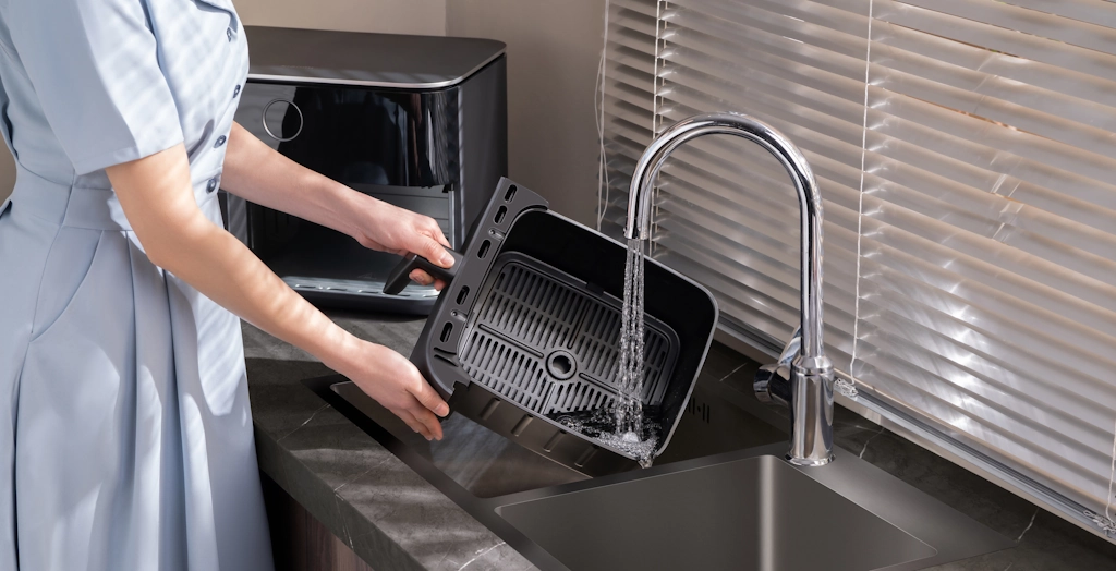 Металлический термостойкий корпус устойчив к высоким температурам и коррозии. Антипригарное покрытие облегчает очистку, а корзины и аксессуары можно мыть в посудомоечной машине. Дополнительные функции включают автоматическое отключение при извлечении корзины и безопасную противоожоговую ручку.