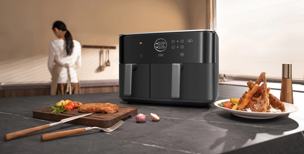 Аэрофритюрница оснащена двумя корзинами: левая объёмом 3,5 л идеально подходит для гарниров, а правая на 6,5 л — для основных блюд, включая целую курицу. Общая вместимость 10 л позволяет с лёгкостью готовить на всю семью и для праздничного стола.