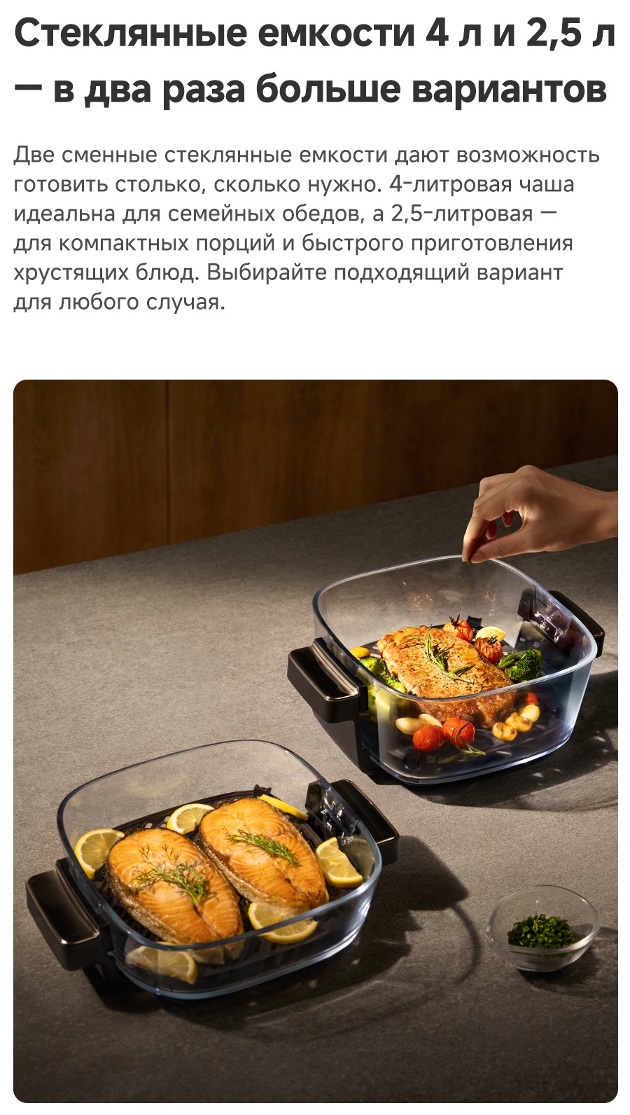 Две сменные стеклянные емкости дают возможность готовить столько, сколько нужно. 4-литровая чаша идеальна для семейных обедов, а 2,5-литровая -для компактных порций и быстрого приготовления хрустящих блюд.
