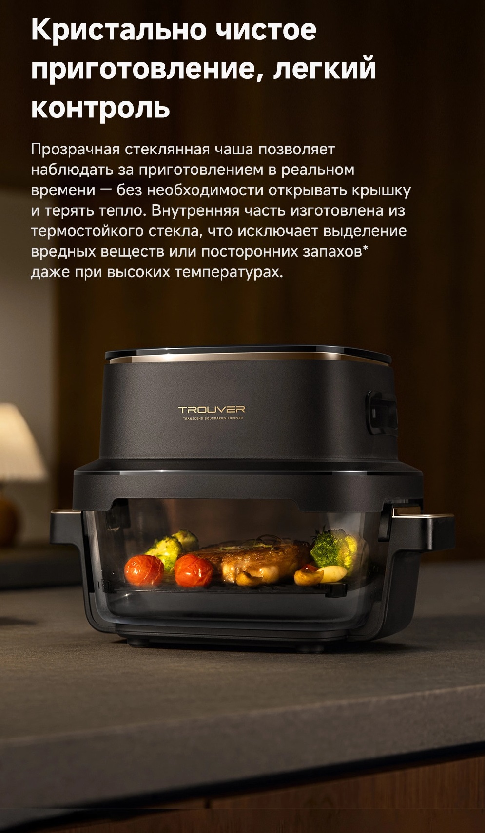 Прозрачная стеклянная чаша позволяет наблюдать за приготовлением в реальном времени - без необходимости открывать крышку и терять тепло.