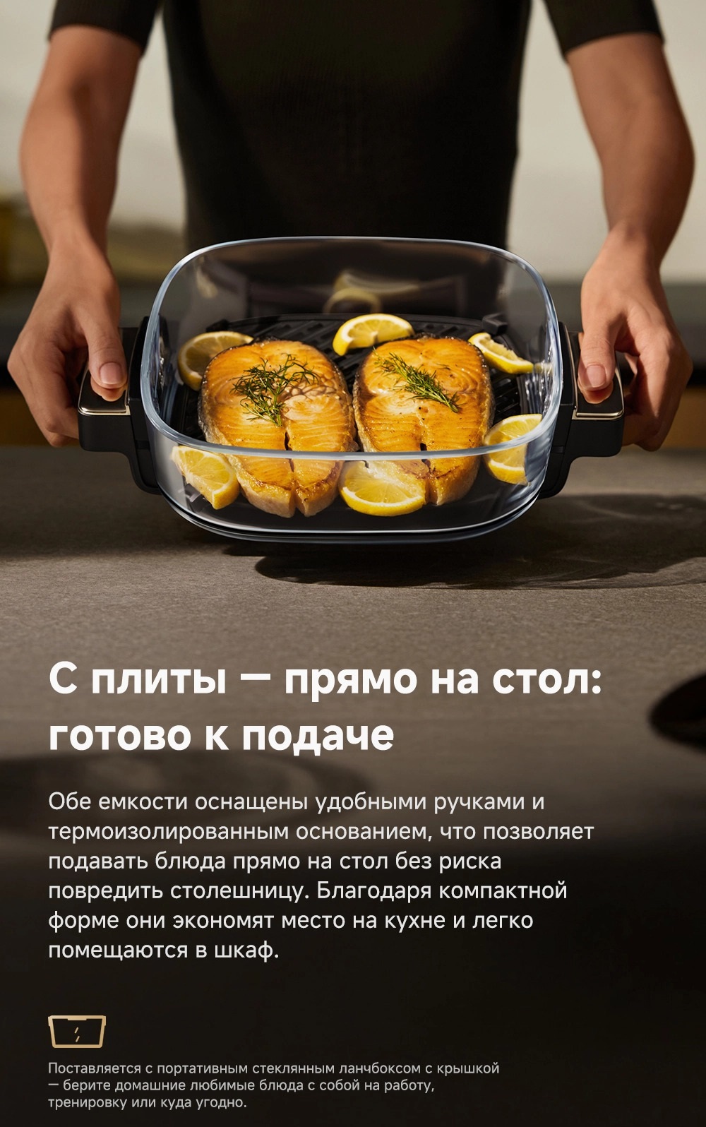 Обе емкости оснащены удобными ручками и термоизолированным основанием, что позволяет подавать блюда прямо на стол без риска повредить столешницу.
