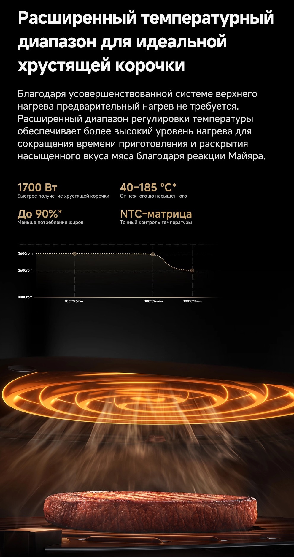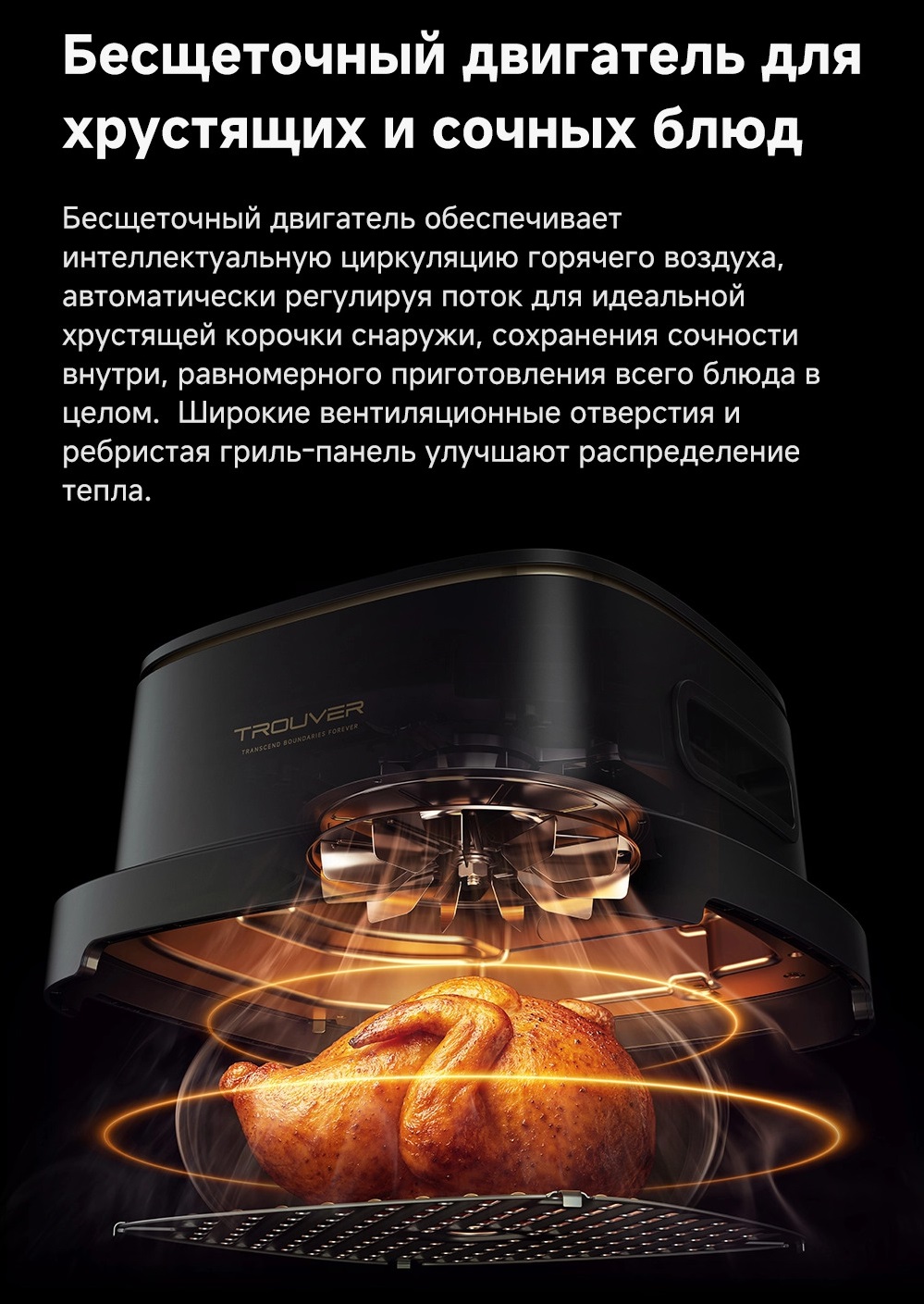 Бесщеточный двигатель обеспечивает интеллектуальную циркуляцию горячего воздуха, автоматически регулируя поток для идеальной хрустящей корочки снаружи, сохранения сочности внутри.