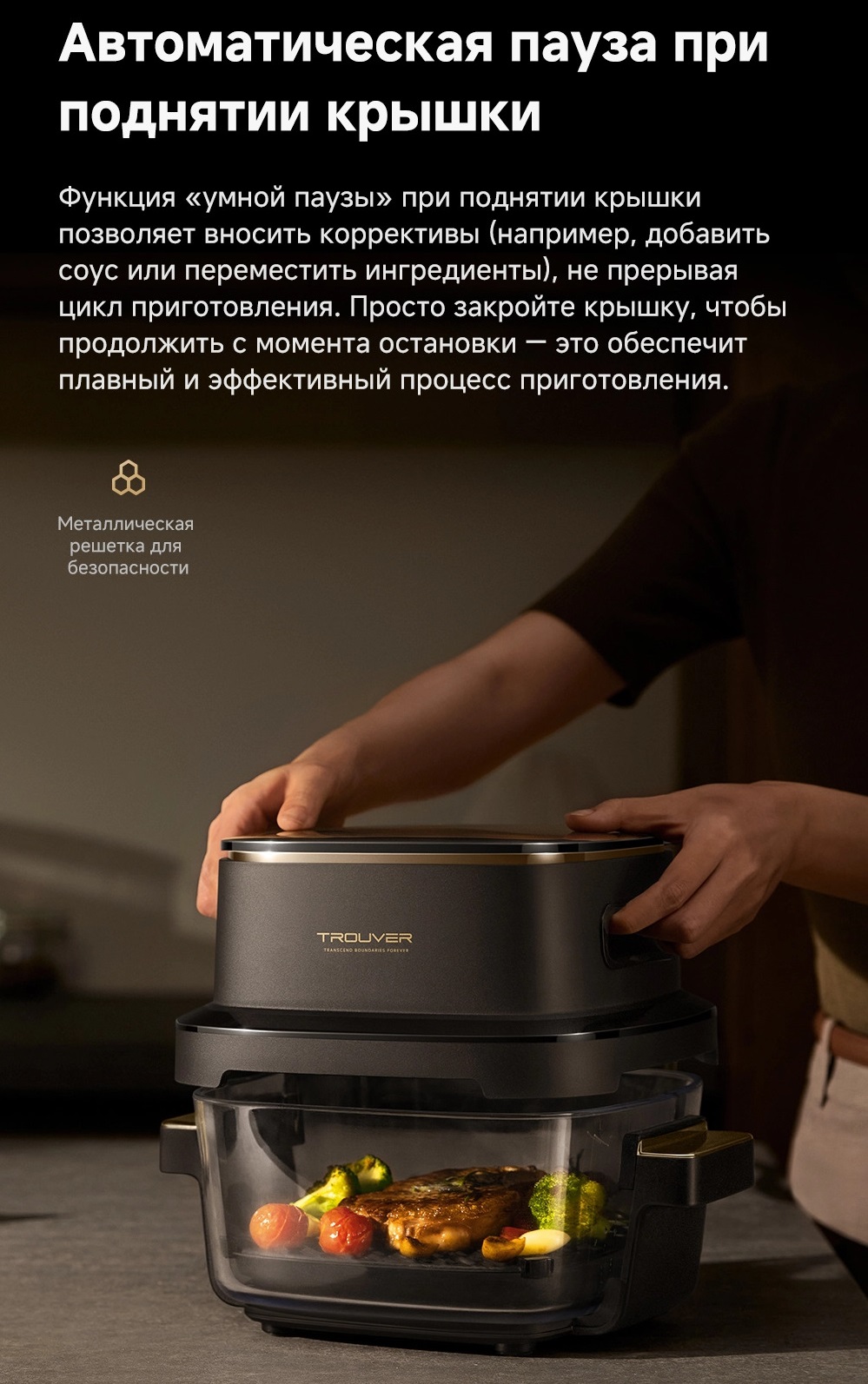 Функция «умной паузы» при поднятии крышки позволяет вносить коррективы (например, добавить соус или переместить ингредиенты), не прерывая цикл приготовления.