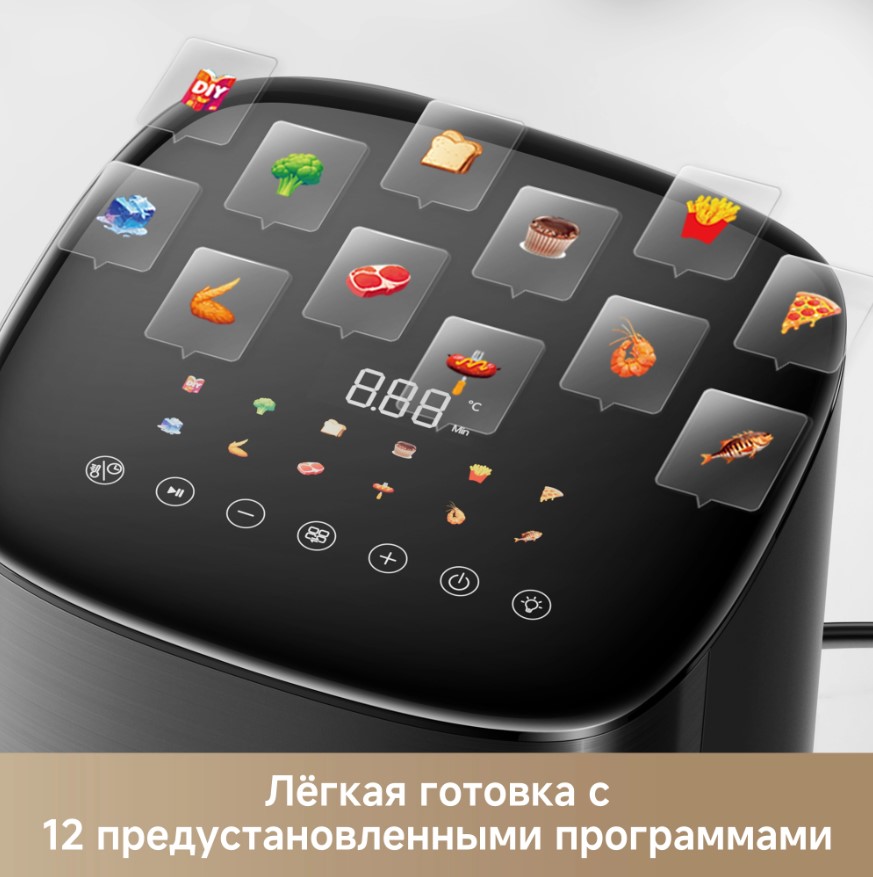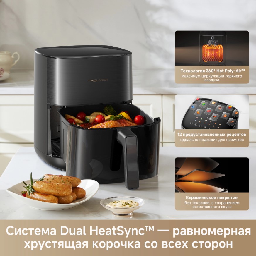 Trouver Air Fryer FD10s Pro — это аэрогриль с мощностью 2000 Вт и ёмкостью чаши 6 литров. Он оборудован технологией Dual HeatSync™, которая обеспечивает нагрев сверху и снизу, а также системой 360° Hot Poly-Air™, благодаря которой воздух циркулирует равномерно. Это позволяет быстро и качественно готовить еду, 12 предустановленных программ и безопасное керамическое покрытие.