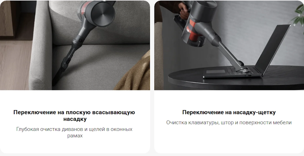 Комбинированная щётка легко переключается между режимами, позволяя очищать узкие щели, углы, полки и мебельные поверхности — без лишних усилий.