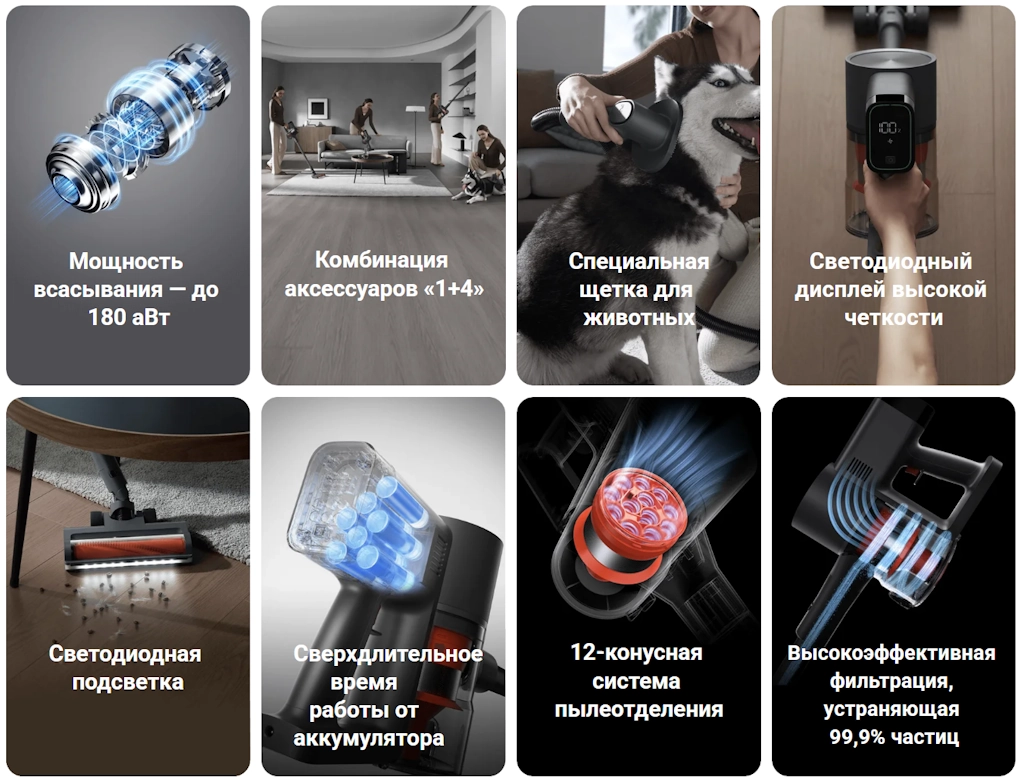 - Дополнительные насадки: насадка для шерсти домашних животных, мини-турбощетка, гибкий шланг