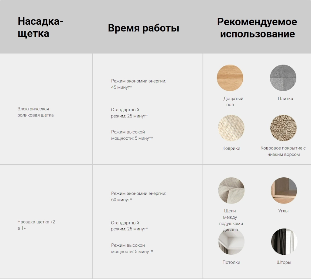 - Комплект насадок: мини-турбощетка, насадка щелевая/щетка, турбощетка