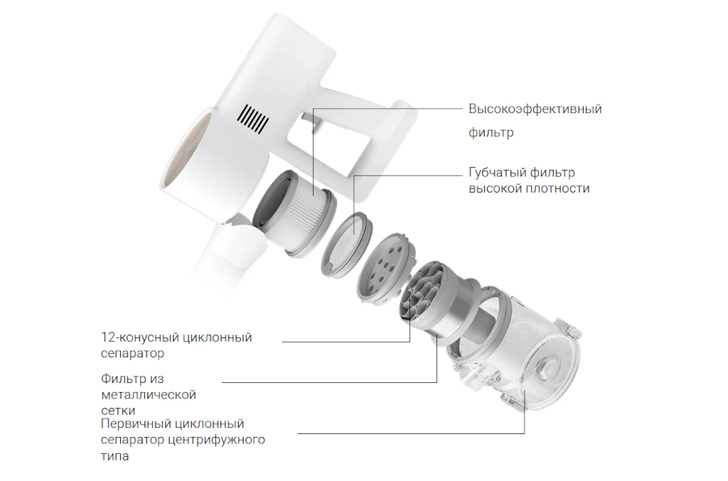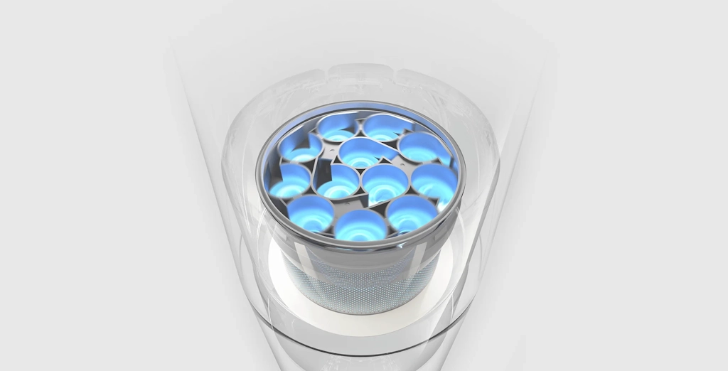Система с 12-ю циклонами создаёт мощное центробежное движение, эффективно отделяя крупные частицы пыли от воздуха. Это предотвращает засорение фильтров и поддерживает постоянную силу всасывания.