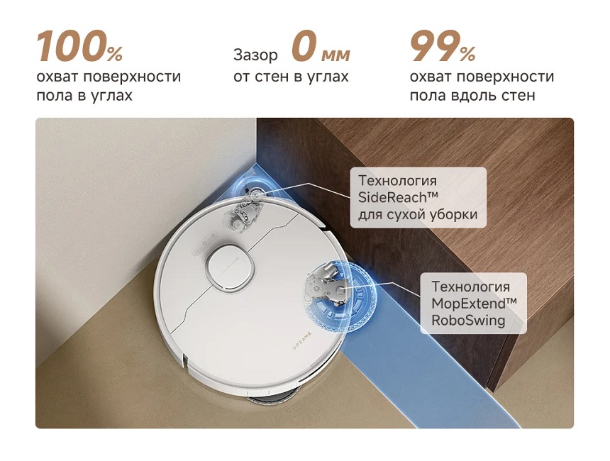Благодаря технологиям SideReach™ для сухой уборки и МорExtend™ Roboswing робот-пылесос легко добирается до труднодоступных углов, участков у изогнутой мебели, мест под низкими предметами и вдоль стен, идущих по прямой линии.
