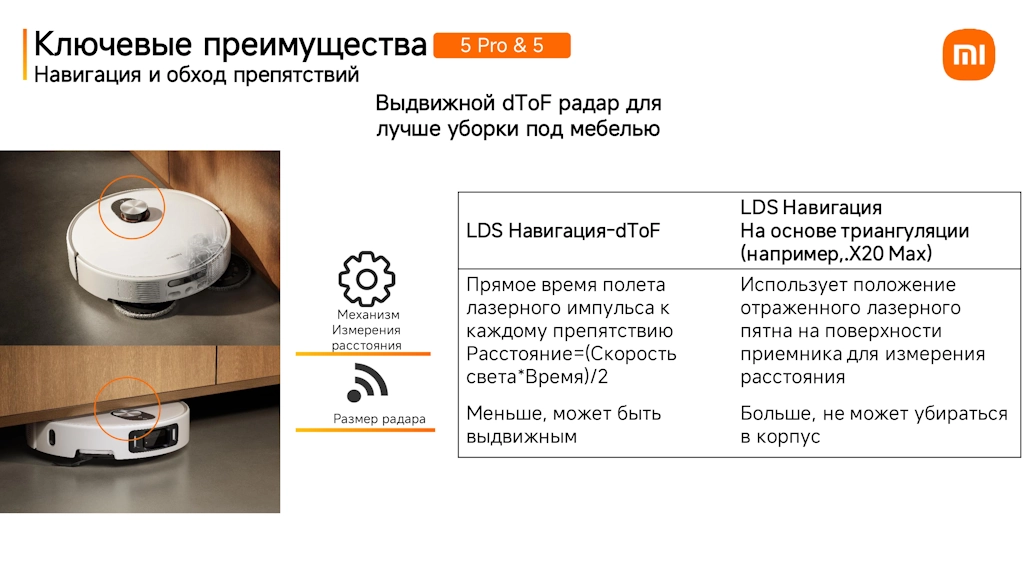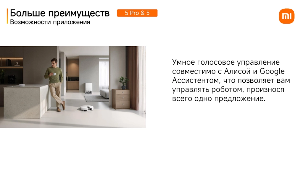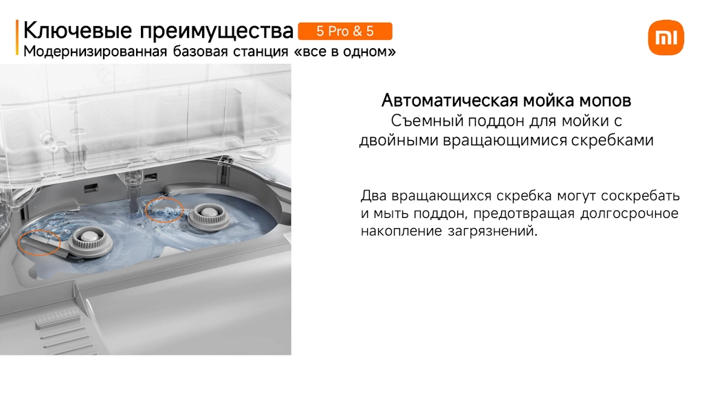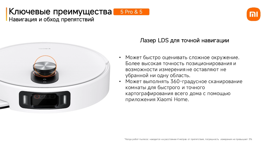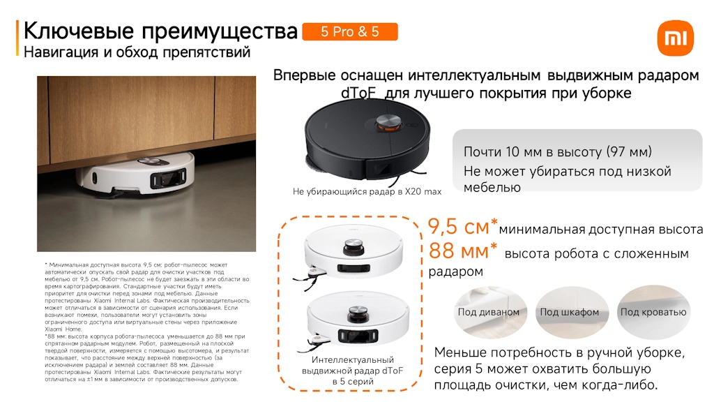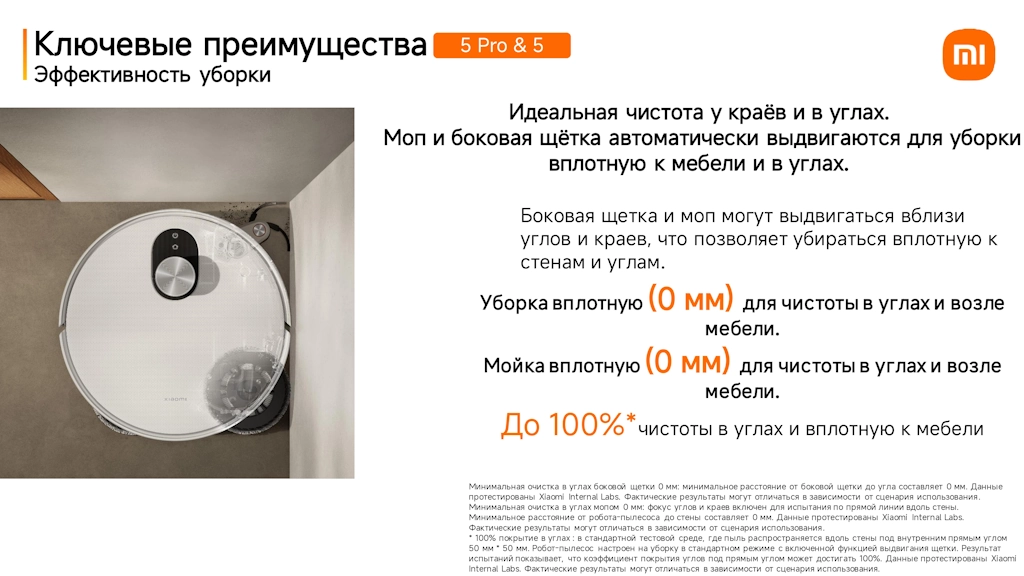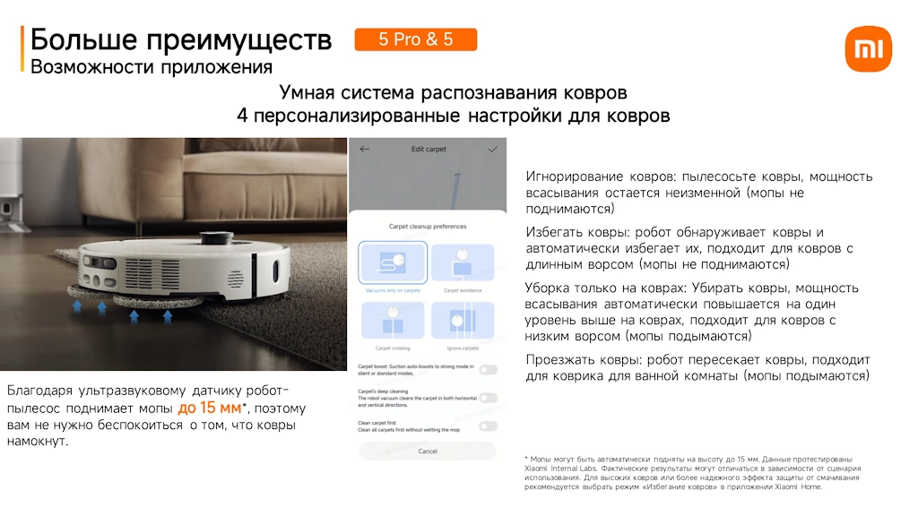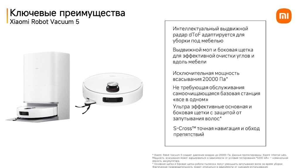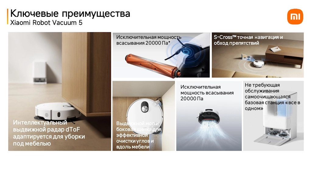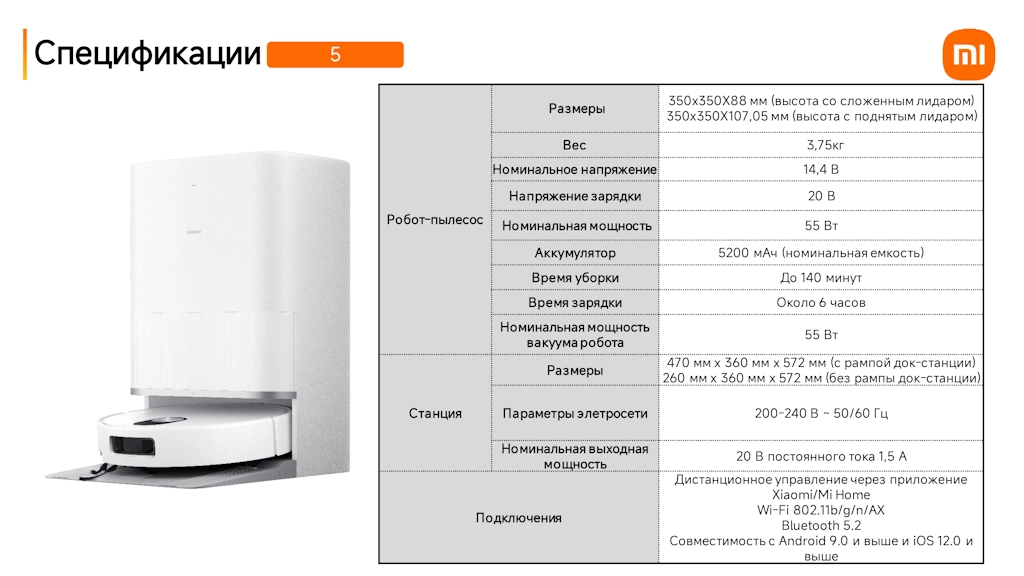 - Особенности: выдвижной dToF-лидар, подъемная швабра (15 мм); преодоление порога: до 20 мм; основная и боковые щетки с системой против запутывания волос и шерсти, выдвижной моп и боковая щетка; голосовое управление, управление через приложение Mi Home/Xiaomi Home