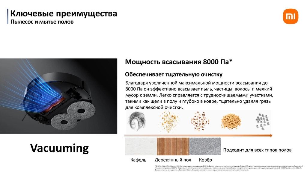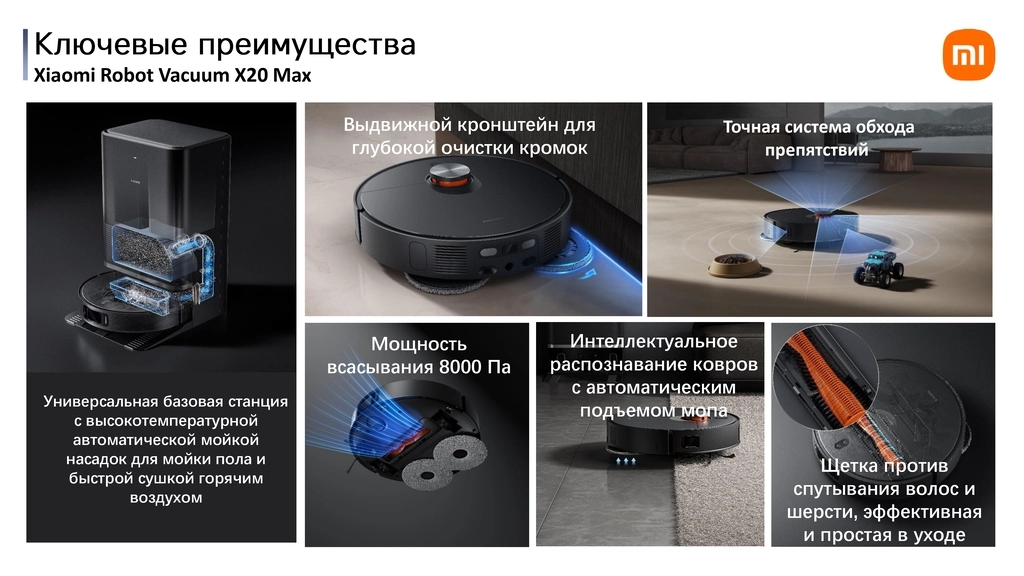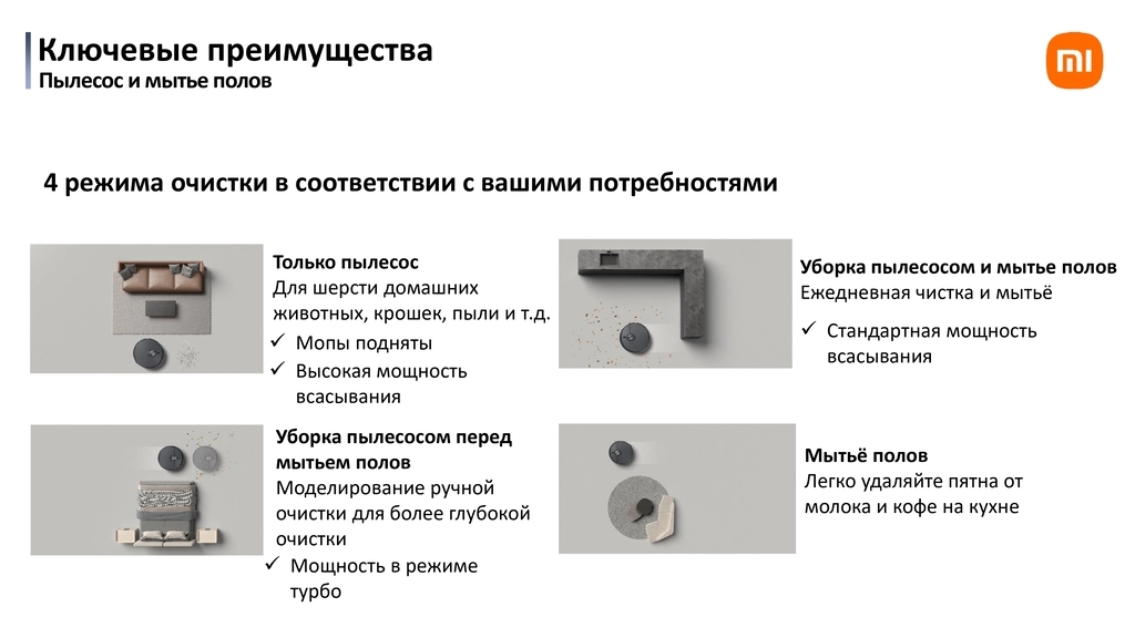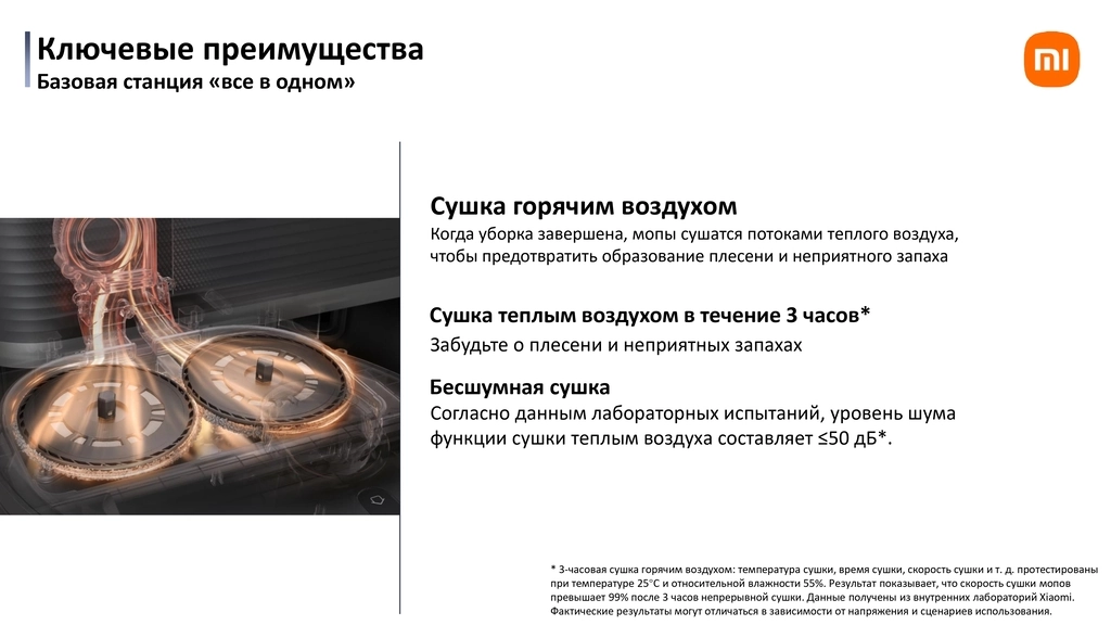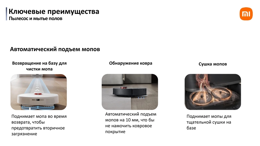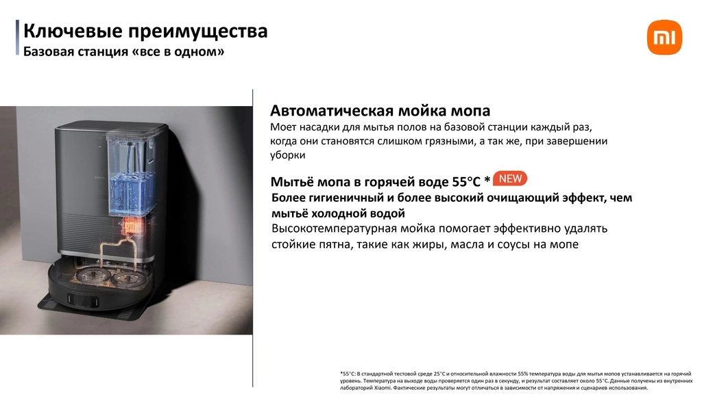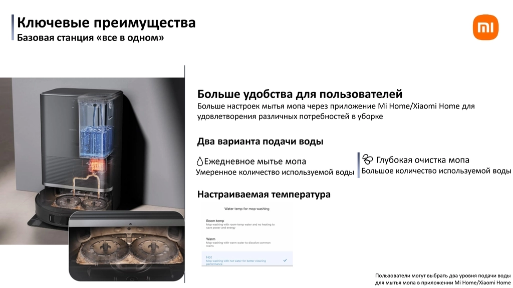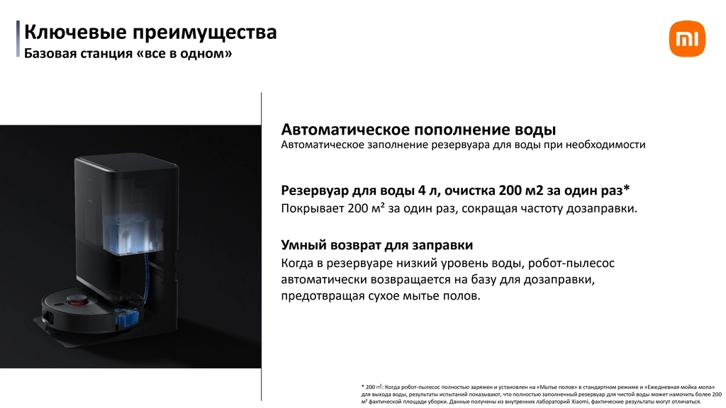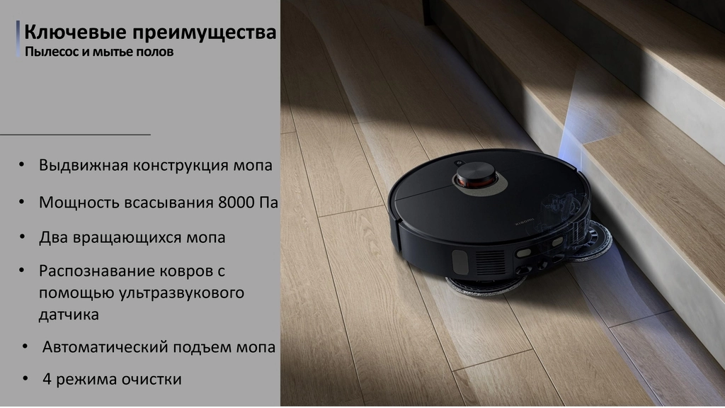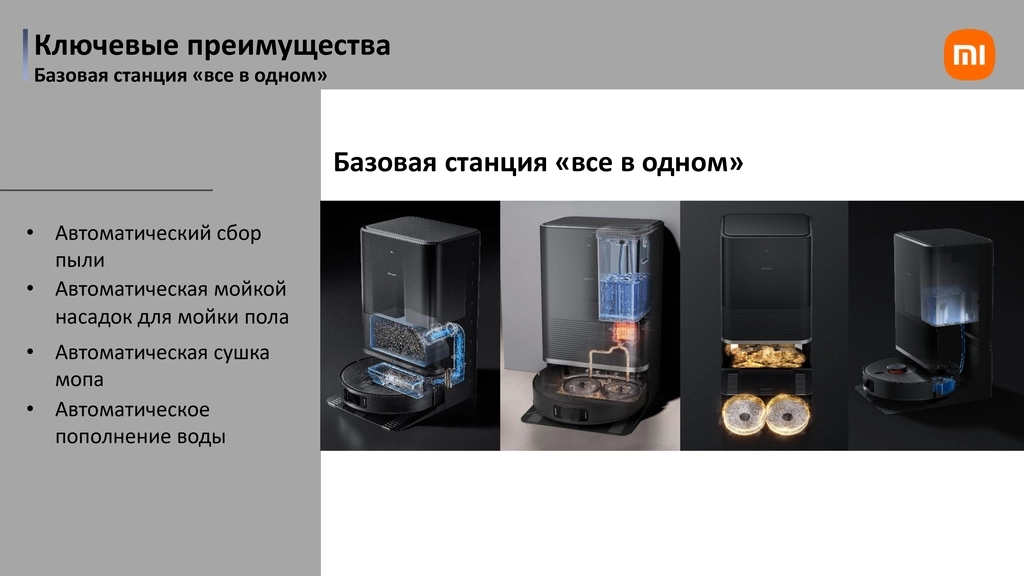 - База самоочистки: да, автоматическая мойка и сушка мопов, самоочистка пылесборника, пополнение воды в пылесосе