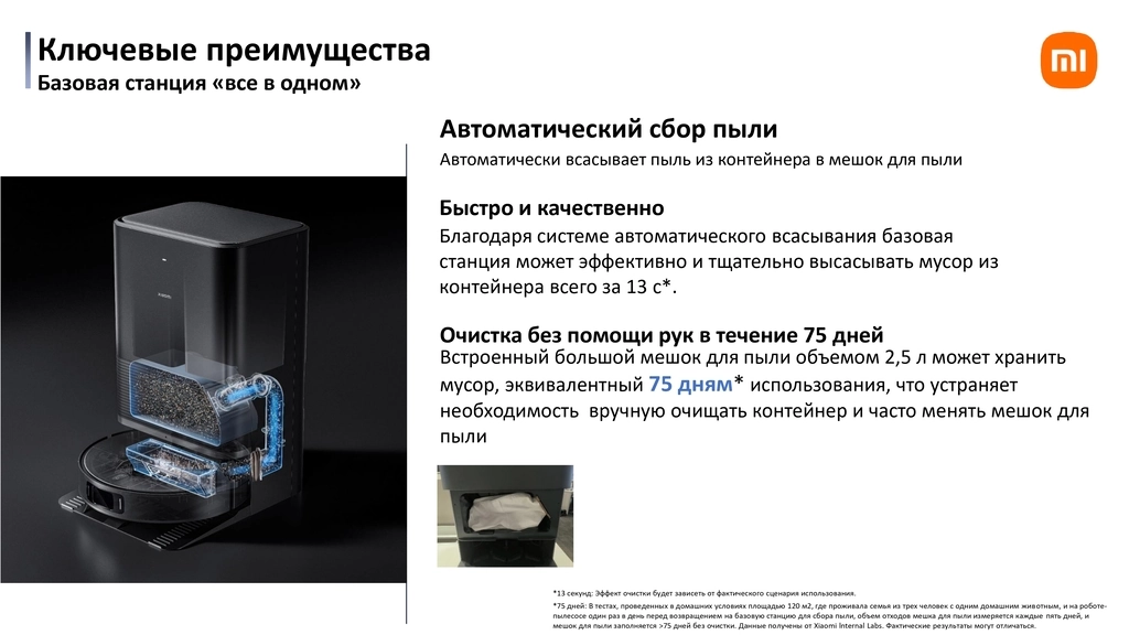 - Объём пылесборника: 0.29 л (пылесос) + 2.5 л (база самоочистки)