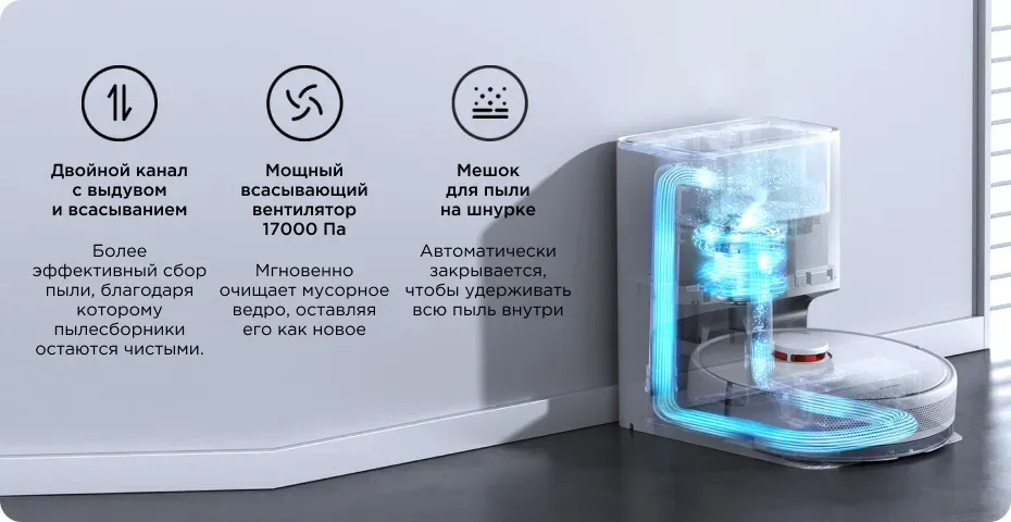 Конструкция для сбора пыли, с мощностью всасывания 17000 Па, состоит из двух каналов, которые мгновенно очищают пылесборник. Отсек с мешком для сбора пыли рассчитан более, чем на 60 очищений. Встроенный пылесборник автоматически закрывается, когда попадает к вам в руки, чтобы частицы пыли не разлетались в пространстве.