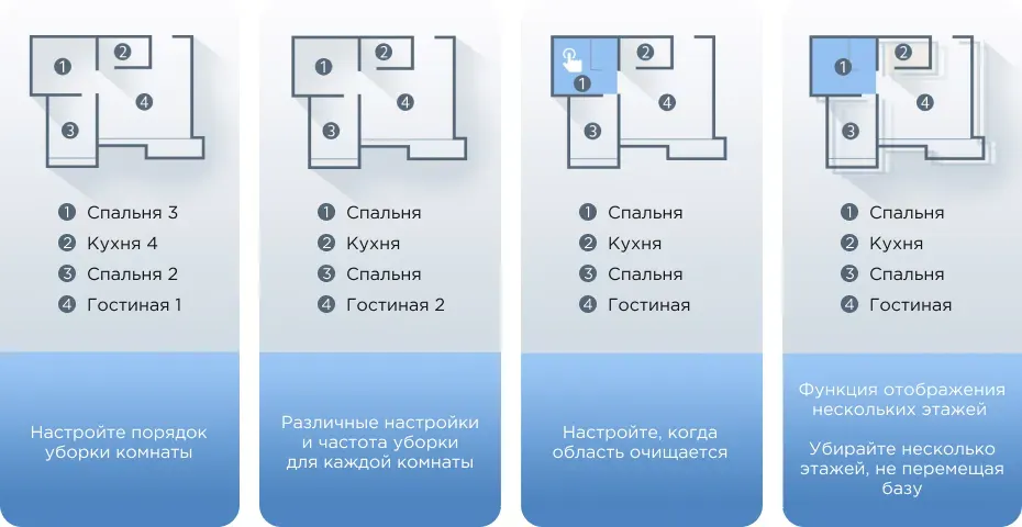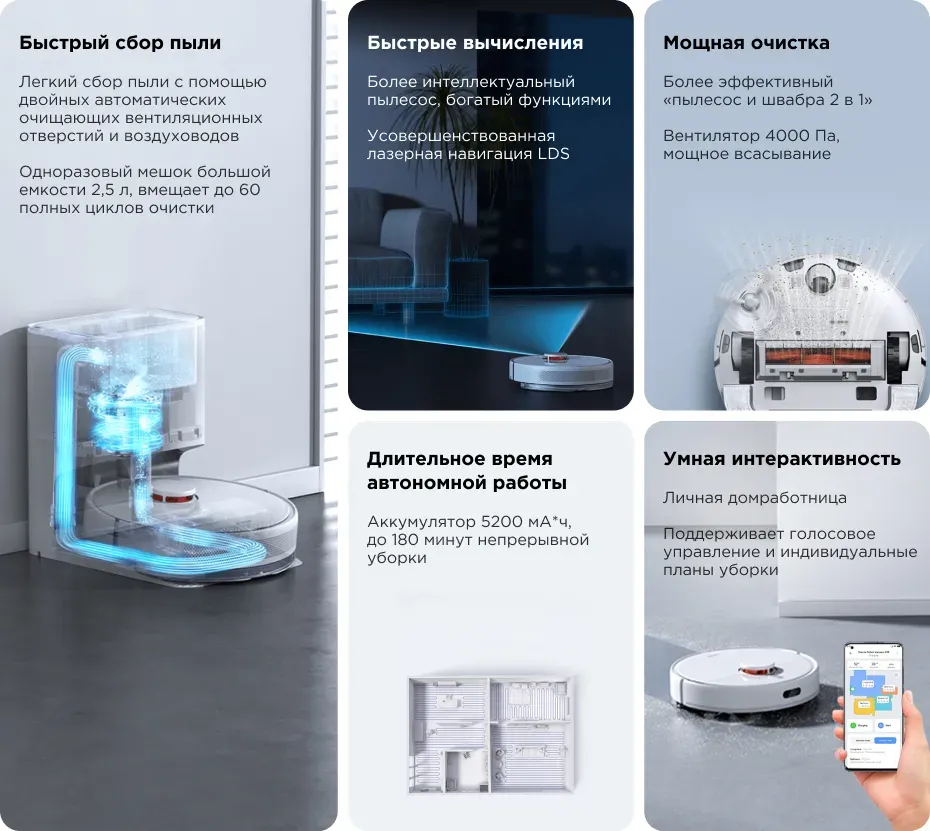 - Функциональные особенности: локальная уборка, уборка по расписанию, виртуальная стена в приложении, автовозврат на базу