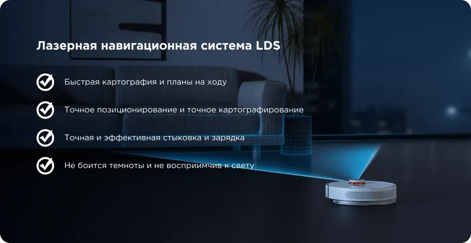 За счет лазерной навигационной технологии LDS нового поколения Xiaomi Robot Vacuum X10 сканирует обстановку дома и во время перерыва составляет карту планировки дома. Xiaomi Robot Vacuum X10 не боится темноты, он с высокой точностью ориентируется в темном пространстве и замедляется во избежание столкновения с препятствием.